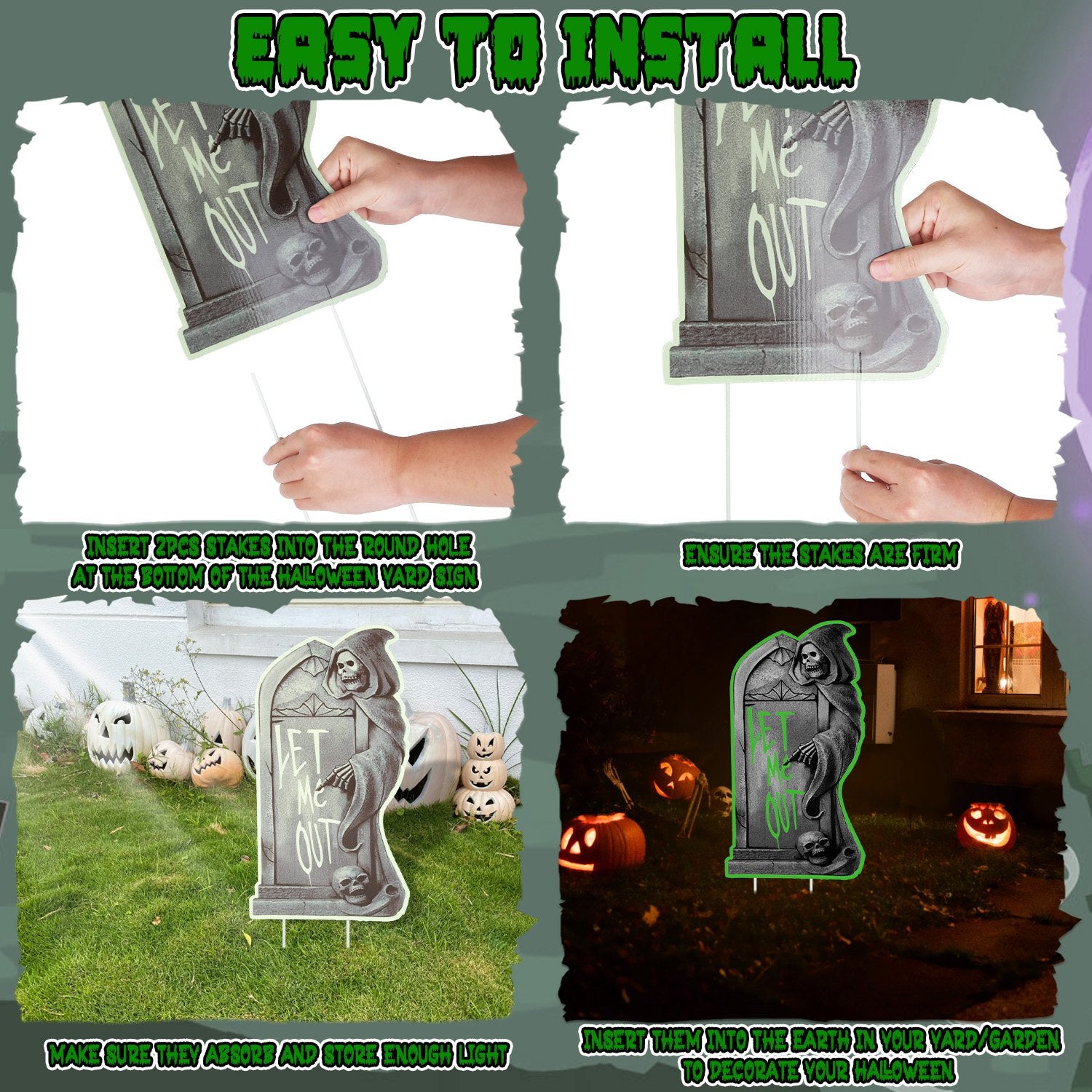 This Funny Glow-In-The-Dark Halloween Decor Set is with a unique fluorescence material/sticker is able to emit eerie light at night after getting enough light(sunlight/lamp). Great to create a scary atmosphere and make your Halloween more memorable! Simply connect with the stakes and insert it into the earth in your yard/garden. Perfect for your Halloween yard decor, spooky entertainment, spooky party, Halloween party decorations, haunted houses party and other themed occasions.