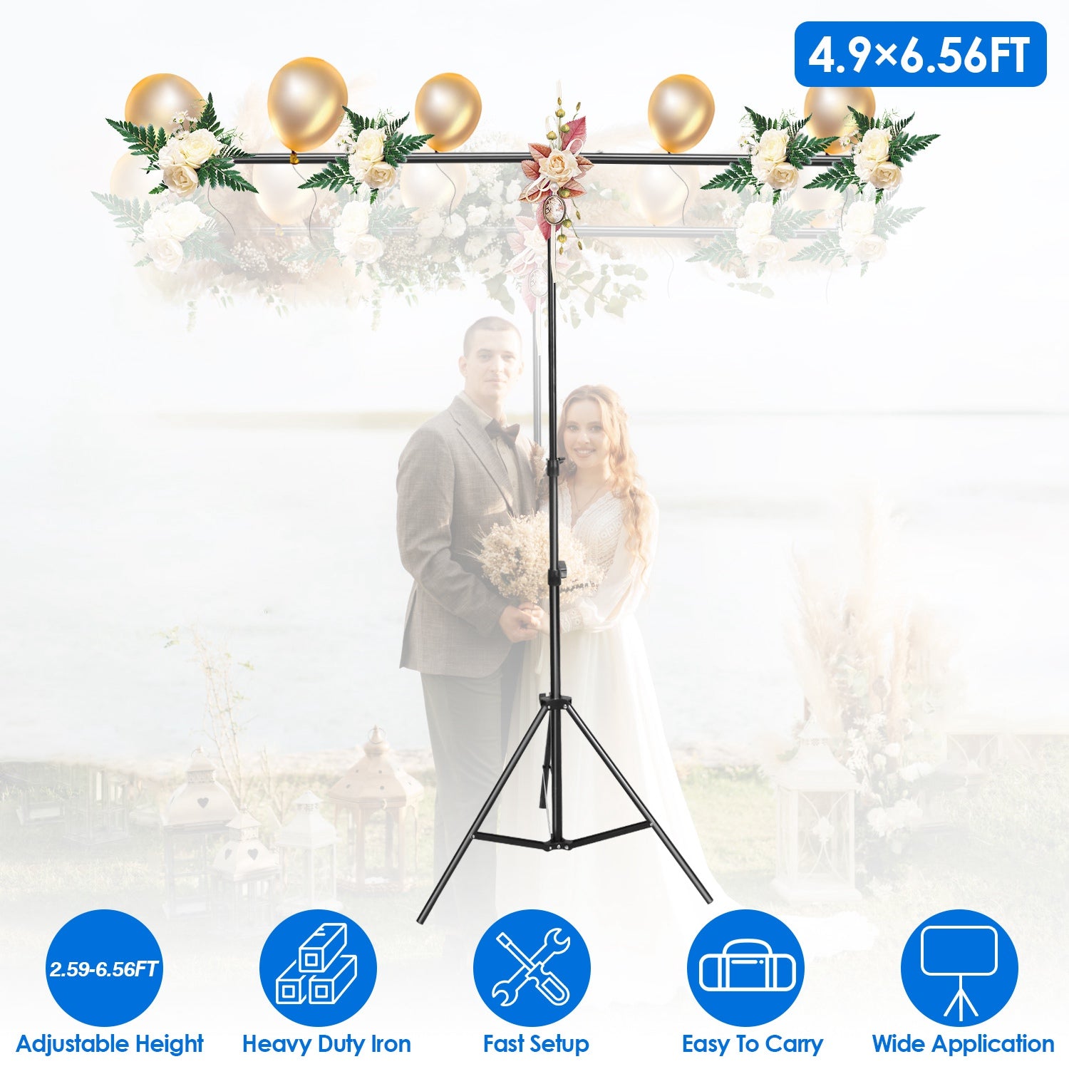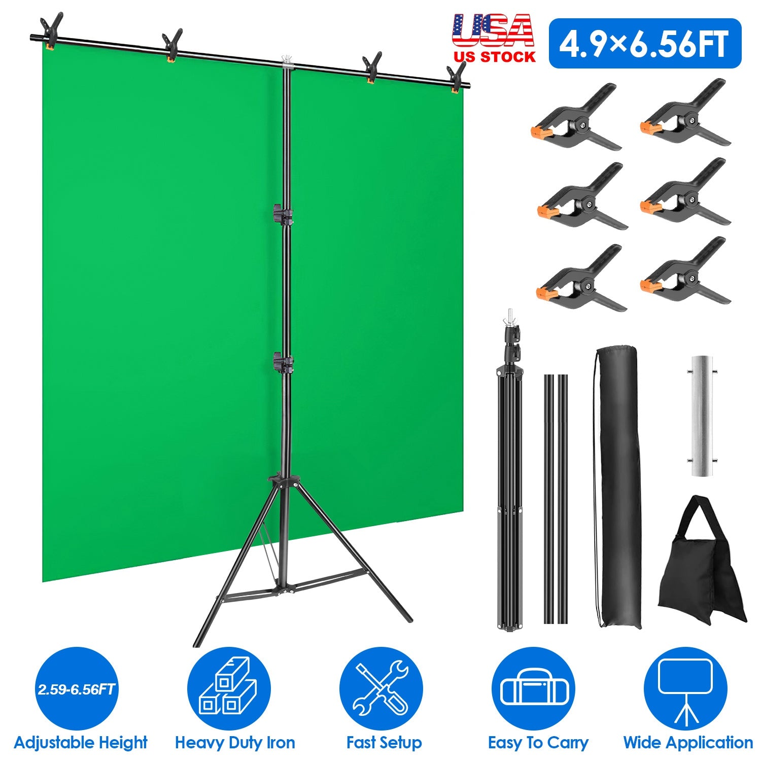 Looking for a portable backdrop stand for your photography or live streaming setup? Crafted from sturdy iron, this 5 6.5ft T shape backdrop stand is durable enough to hold backdrops within 3kg/6.61lbs, ensuring them stay in place throughout your shoot or event. Offer an 2.59-6.56ft adjustable height catering to diverse shooting needs. The 6Pcs spring clamps grip canvas, muslin or paper backdrops tightly. Suitable for live streaming, photography studios, weddings, and parties. Easy to assemble and disassemble. Come with 1 sandbag and 1 carry bag for easy storage and transporting. Upgrade your photo or video studio today with this portable backdrop stand!