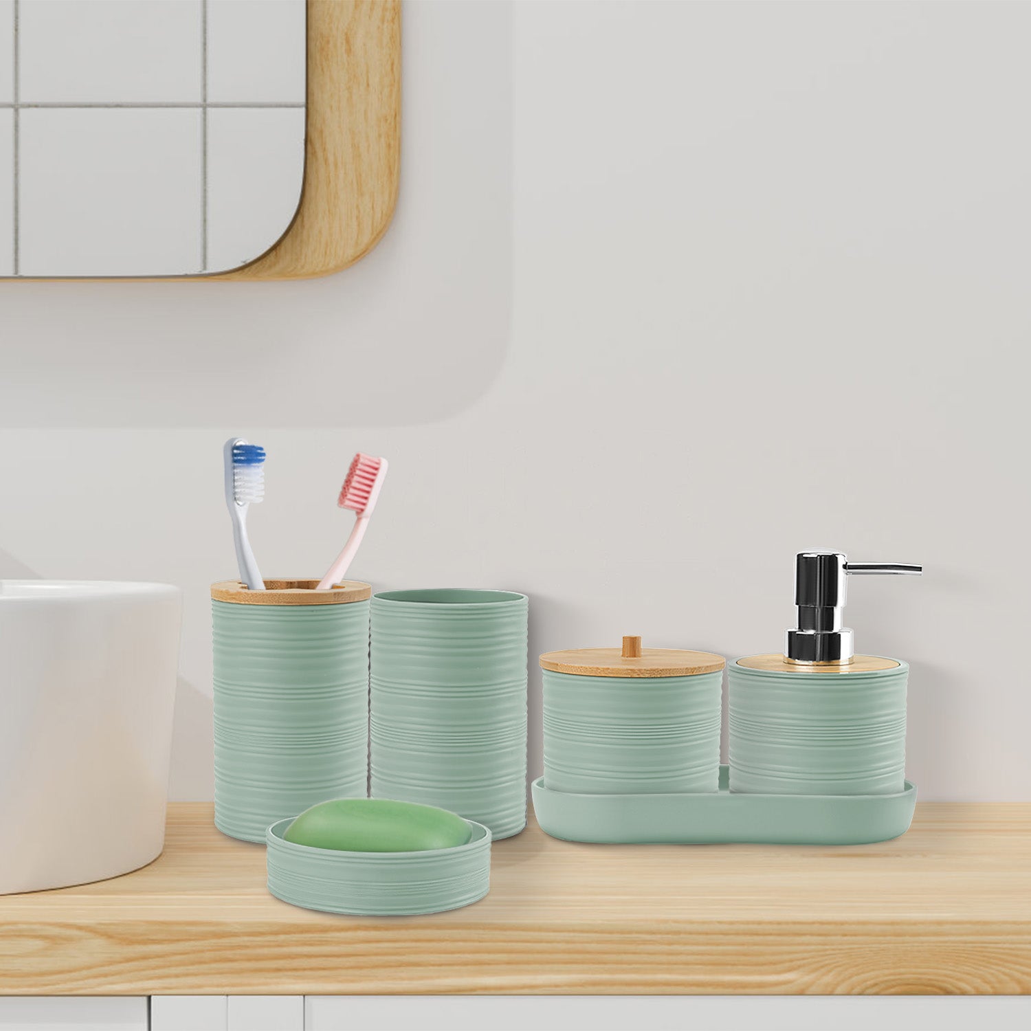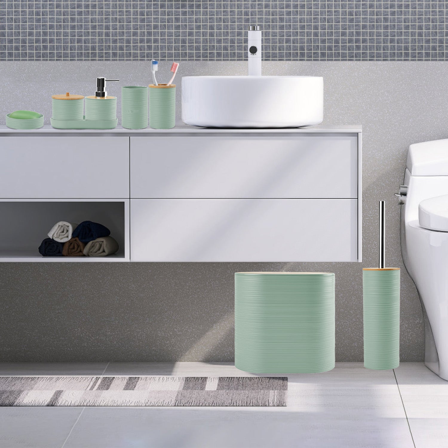 Looking for a complete bathroom set? Package includes 1 x Trash Can With Lid, 1 x Toilet Brush With Holder, 1 x Soap Dispenser, 1 x Toothbrush Holder, 1 x Toothbrush Cup, 1 x Soap Dish, 1 x Qtip Holder With Lid and 1 x Vanity Tray, 8 pieces in total, covering all your bathroom basic needs. A perfect way to organize your bathroom space and add a touch of style. Choose from Black, White, Green, Coffee, Grey as needed and enjoy a clutter-free, elegant bathroom. Upgrade your bathroom today!