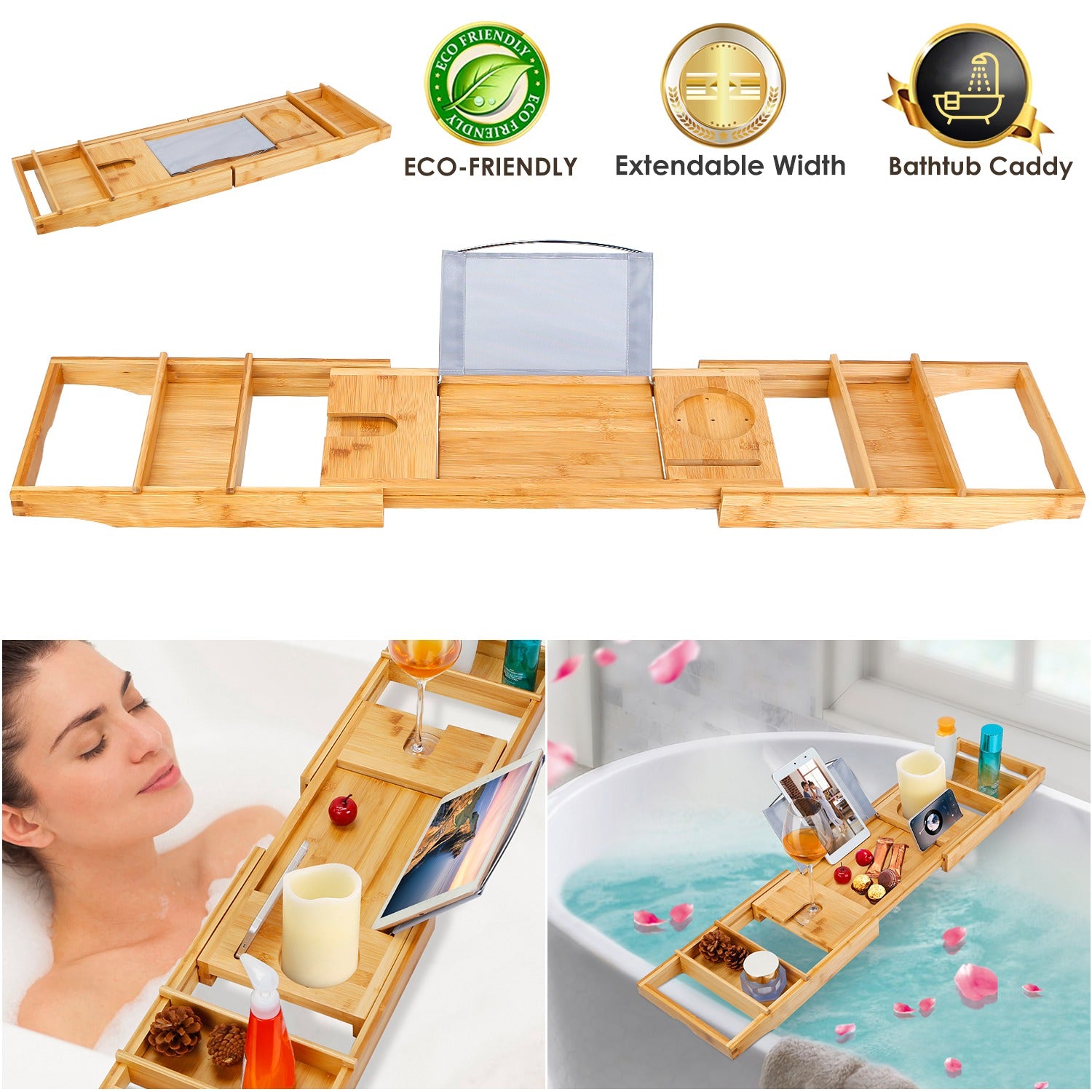 Bathtub Caddy Tray Crafted Bamboo Bath Tray Table Extendable Reading Rack Tablet Phone Holder Wine Glass Holder Shelf Desk Bathroom Spa