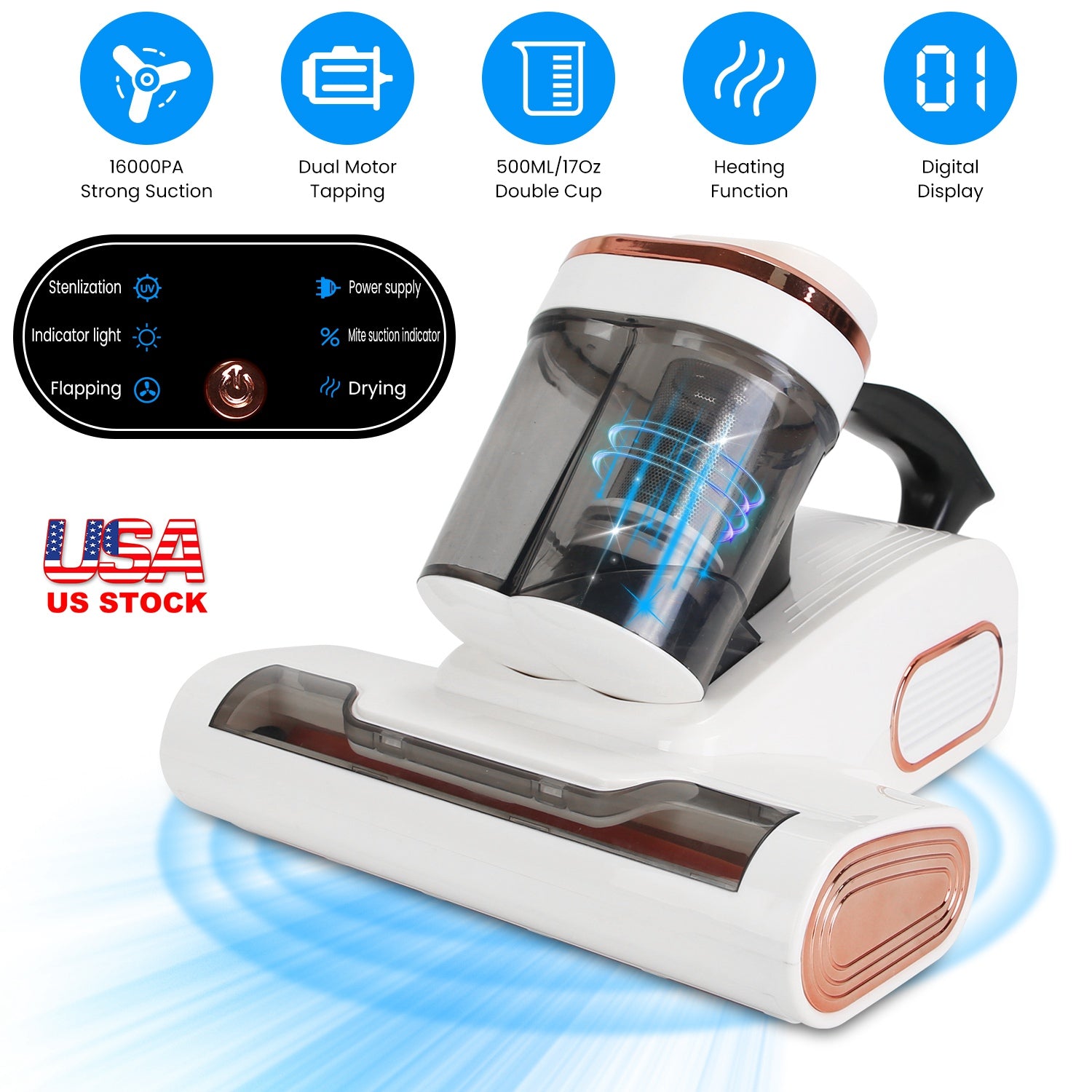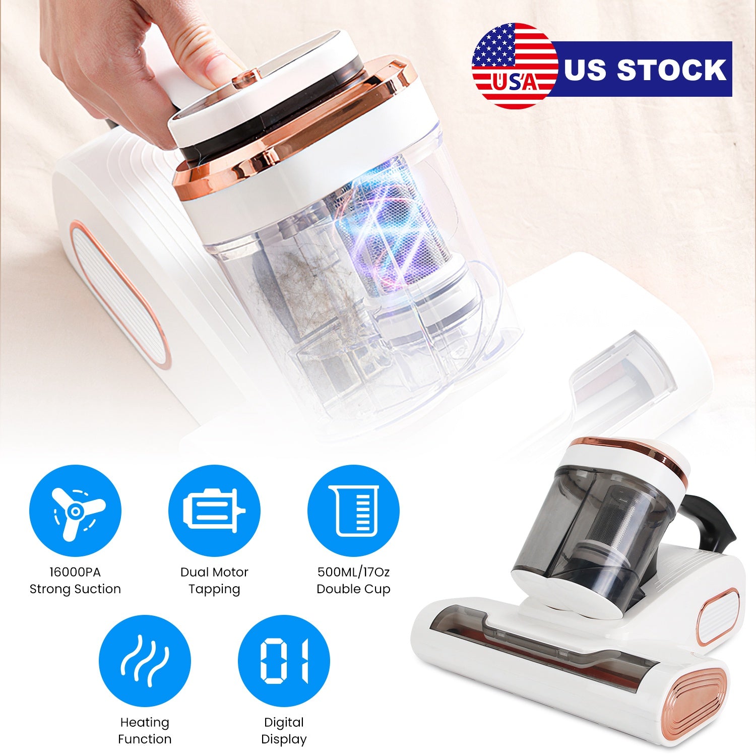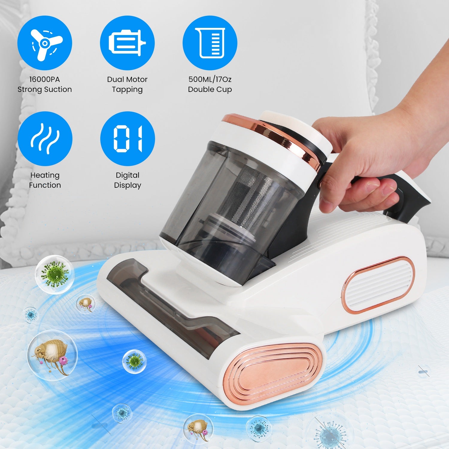 16000PA Double-Cup Bed Vacuum Cleaner 500W Mattress Handheld Vacuum Dust Mites Remover with Heating Function for Bed Sofa Rug