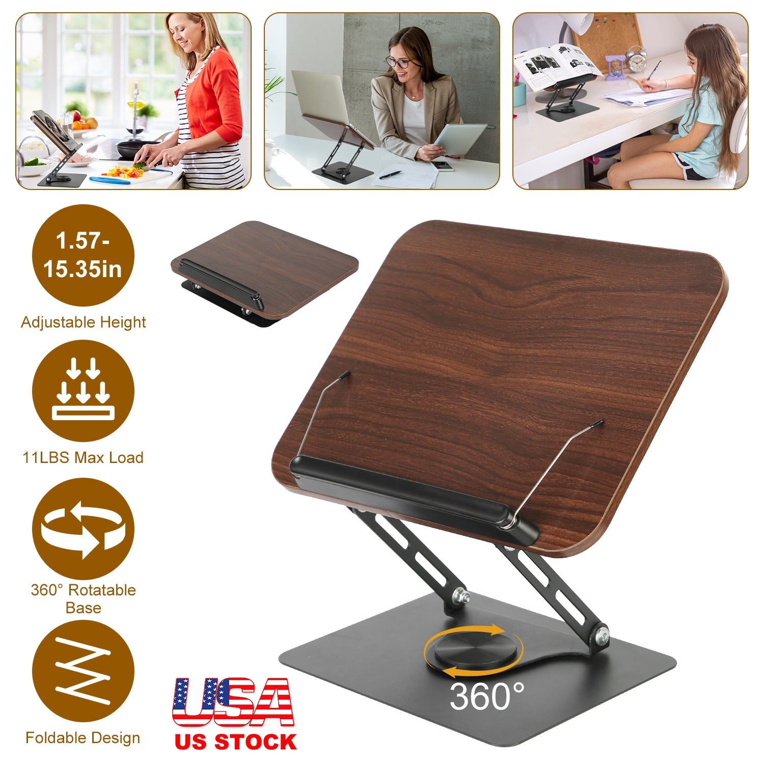 Book Stand for Reading Foldable Wood Book Holder Reading Rack Paper Stand with Adjustable Height 360¡ Rotatable Base Dual Paper Clips for Book Sheet M