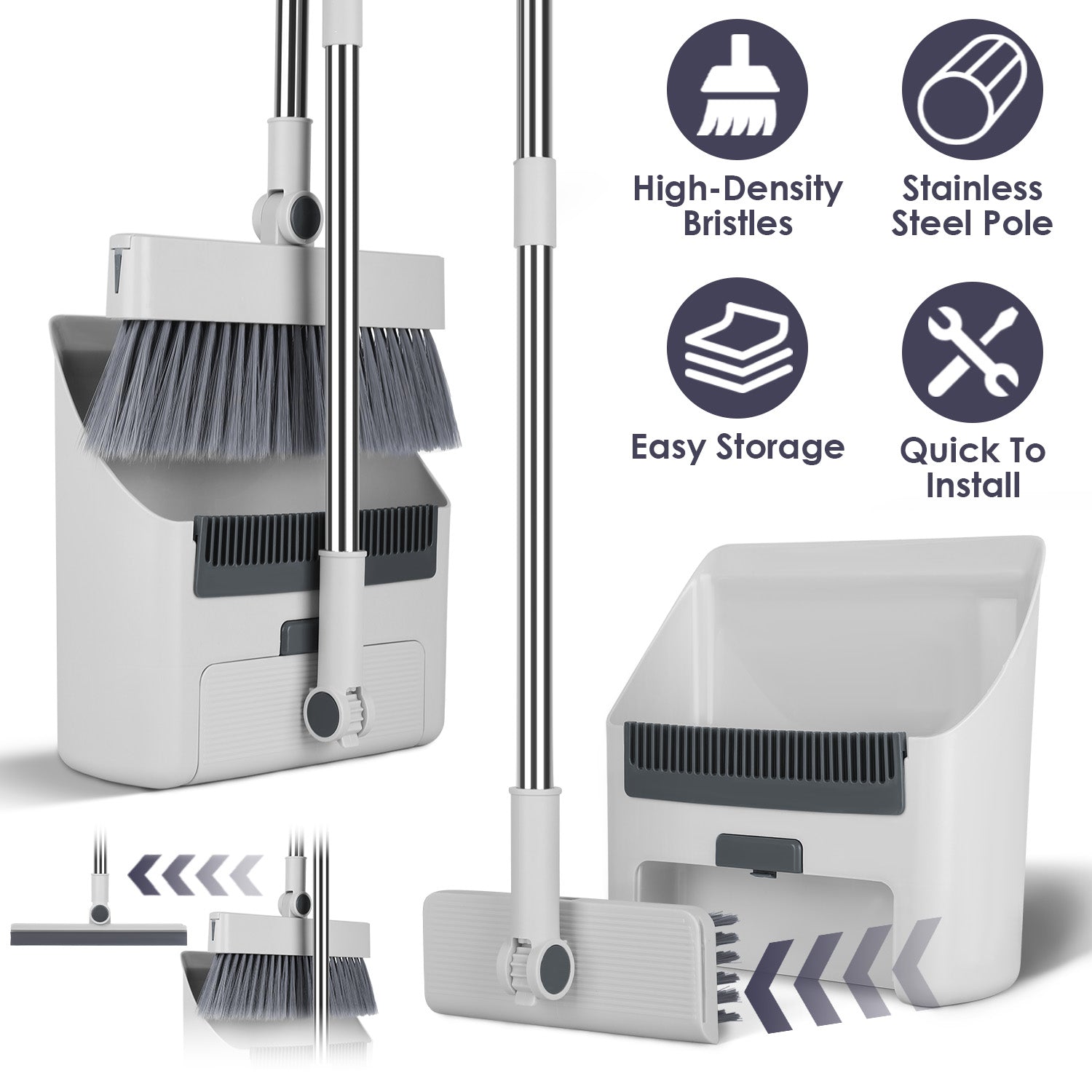 Broom And Dustpan Combo Set With Squeegee Stainless Steel Handle 4 In 1 Upright Standing Broom And Dust Pan For Indoor Outdoor Garage Kitchen Room Off
