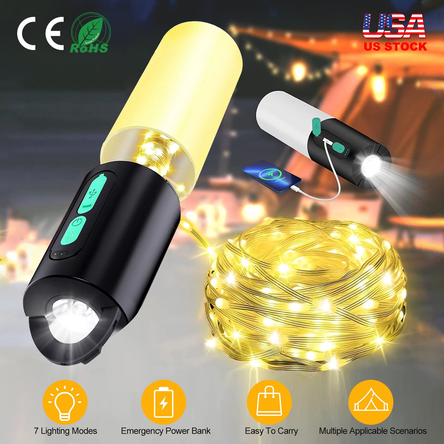 4 In 1 Rechargeable Camping String Light IP44 Waterproof Camping Lantern with 33Ft String Light 7 Light Modes Emergency Power Bank Carry Bag for Indoo