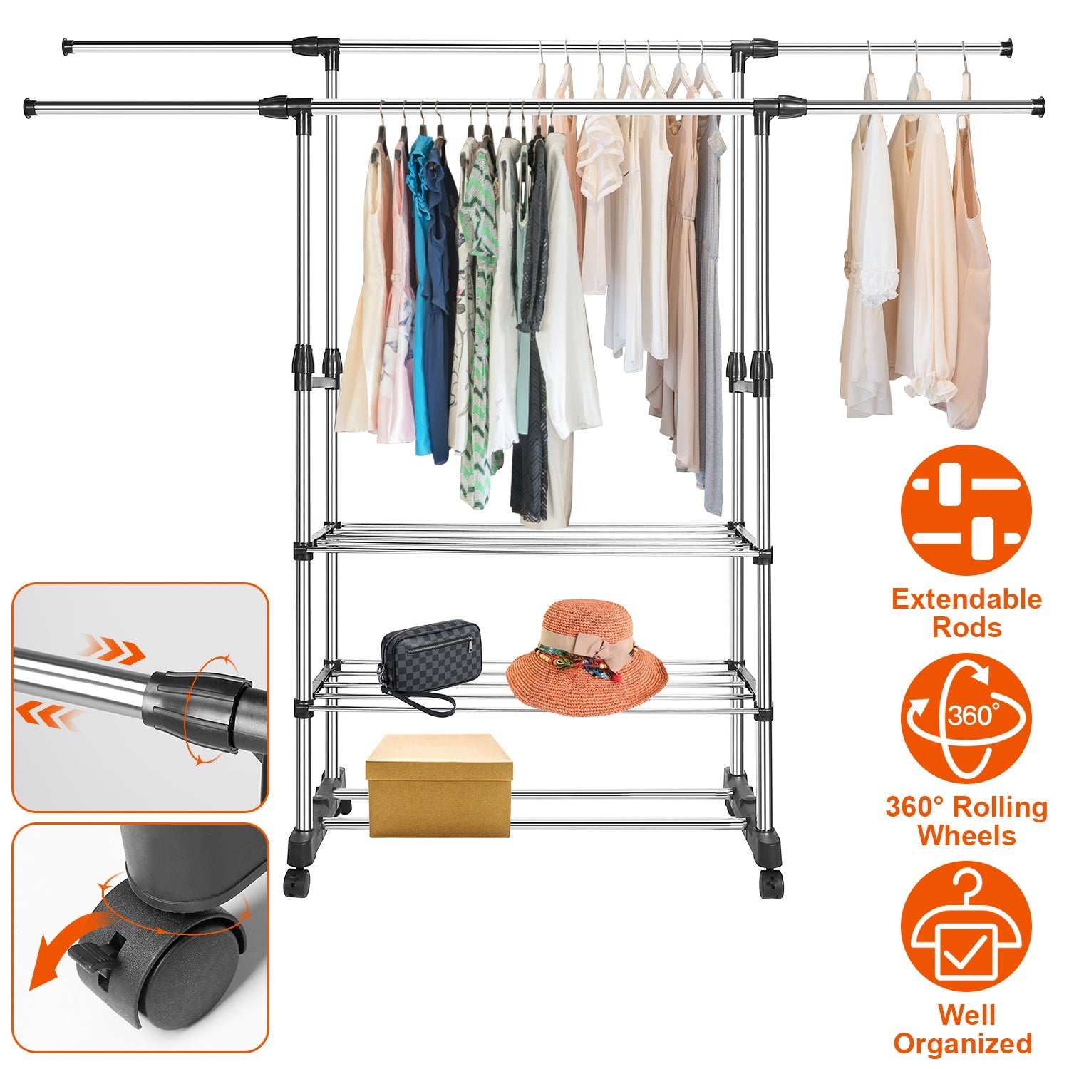 Extendable Garment Hanging Rack Clothing Hanging Rail Pillow Shoe Display Organizer w/ Rolling Wheels Hold up to 77LBS