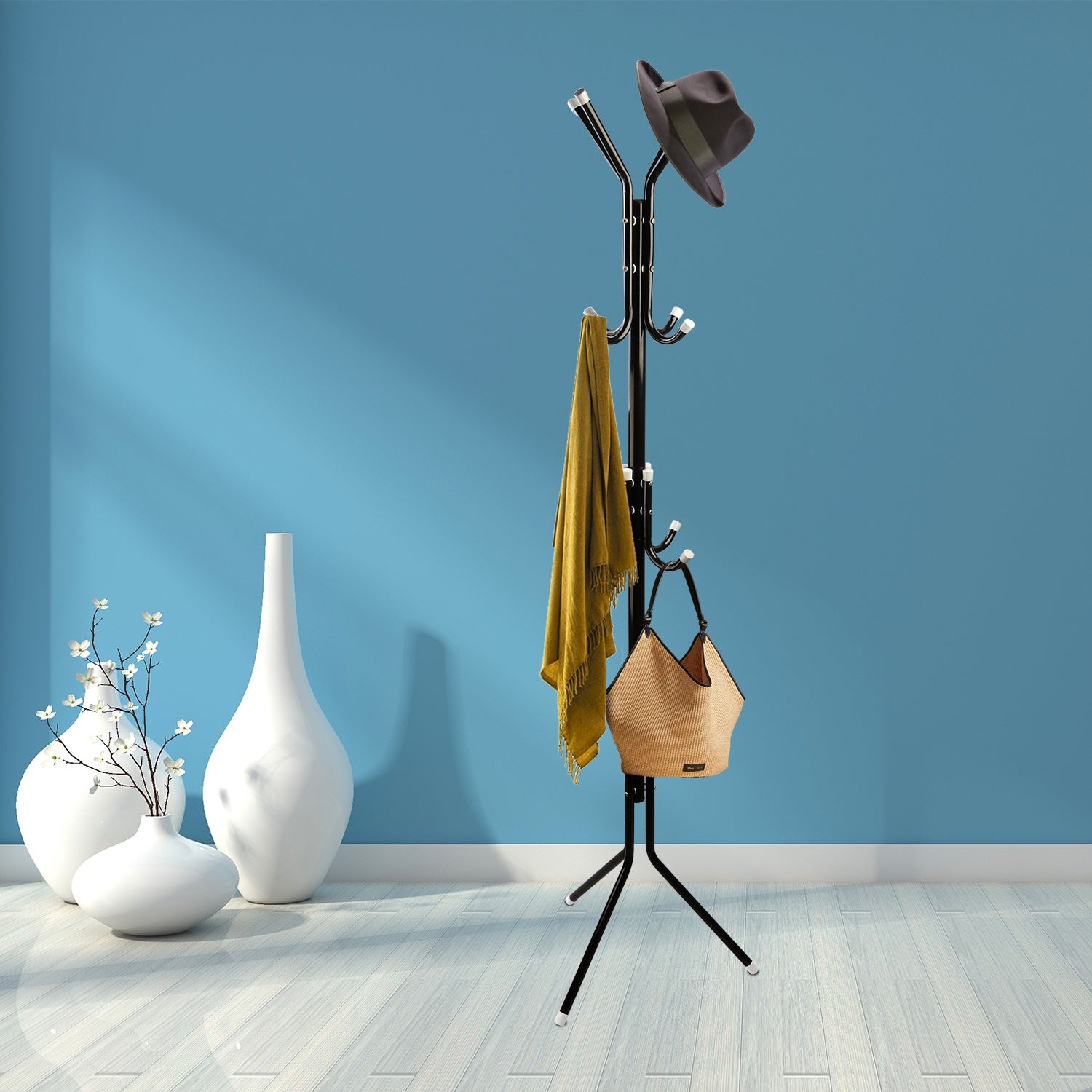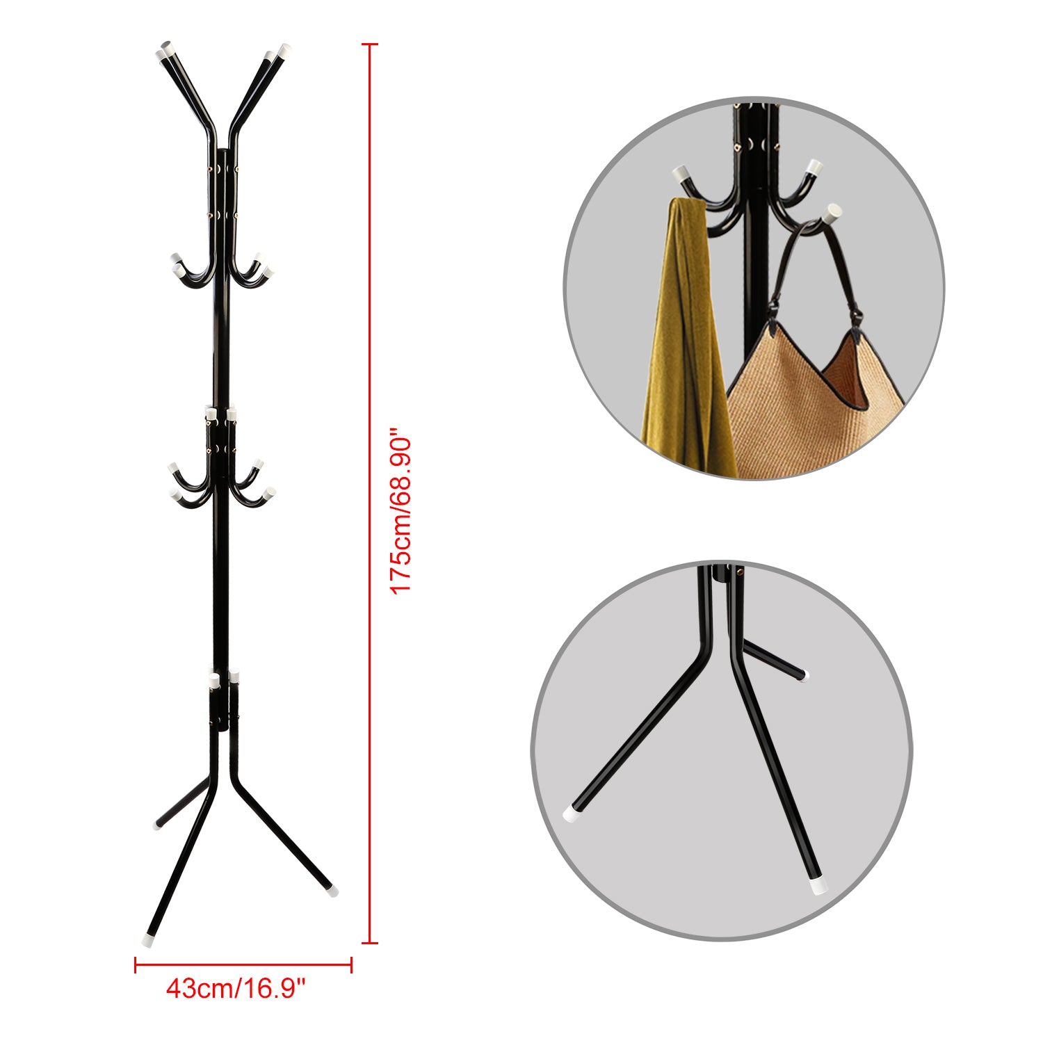 With this stylish standing coat rack, you can easily keep your coats, hats, purse, and handbag accessible when you walk in or leave out. To assemble this rack, it is simple and just requires nothing but a simple screw driver. Get the screws to actual tap into the holes, particularly with the screwdriver included, to connect all the legs and hooks. Then it is ready to service. Stylish standing style design makes it going well with any piece of furniture and without taking up much space so that you can put it at any room. Note: ItÕs made from icon with electrostatic spray so it needs to keep dry and clean for continued service.