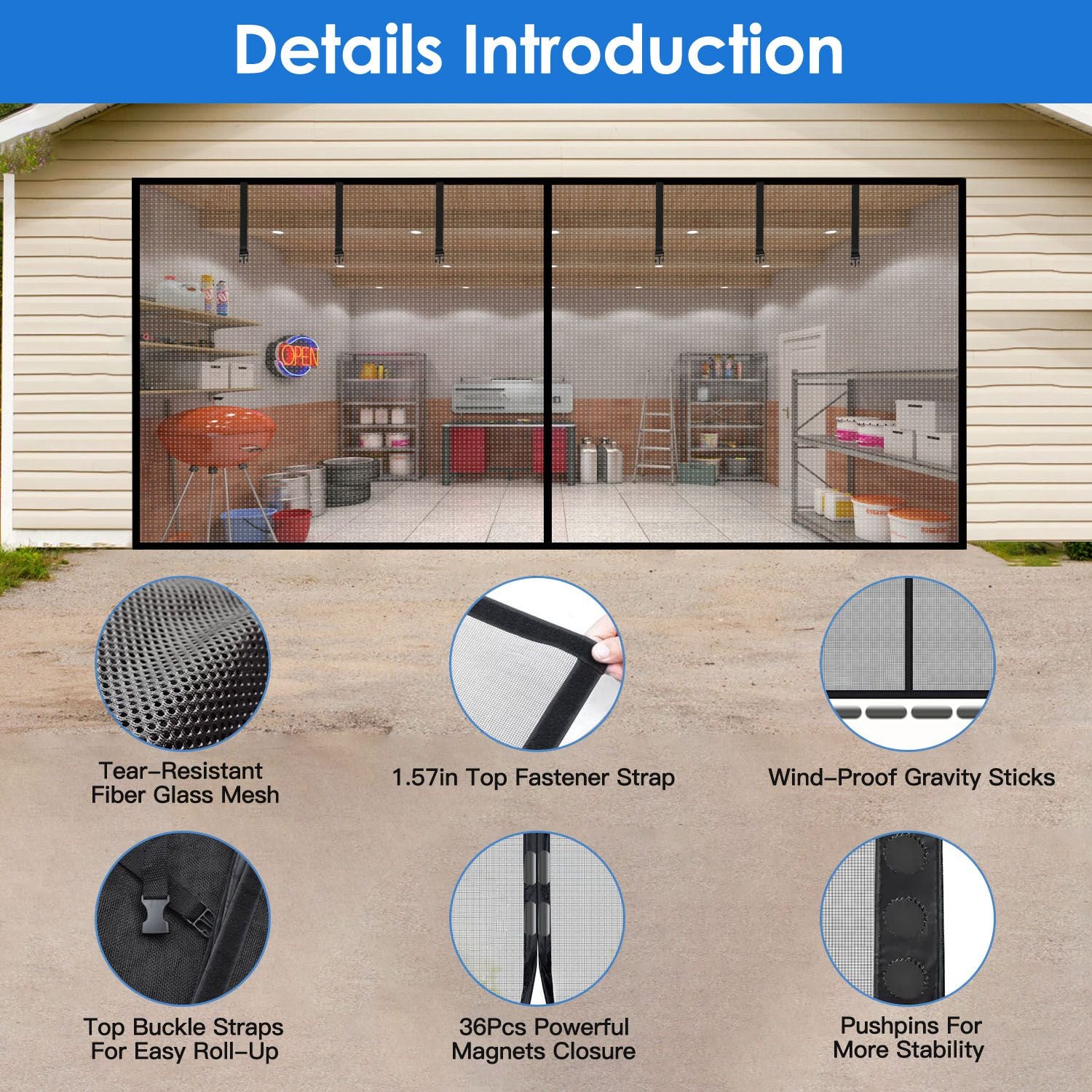 Are you ready to enjoy your leisure time in the garage with your family without annoying mosquitoes/dirty dust? Our single-door/double-door screen is easy to install and is durable enough to use for a long time. Equipped with 36Pcs strong magnets in the middle seam of the screen door which ensures that the screen will close automatically quickly every time and maintained best sealing. Bottom gravity sticks ensure windproof performance but allows kids/your dogs/cats walk through easily. Top buckle straps allow you to roll up the door screen for car entry and exit. Not only for your garage, but also for patio, outdoor workshop, a home gym, garden, etc..