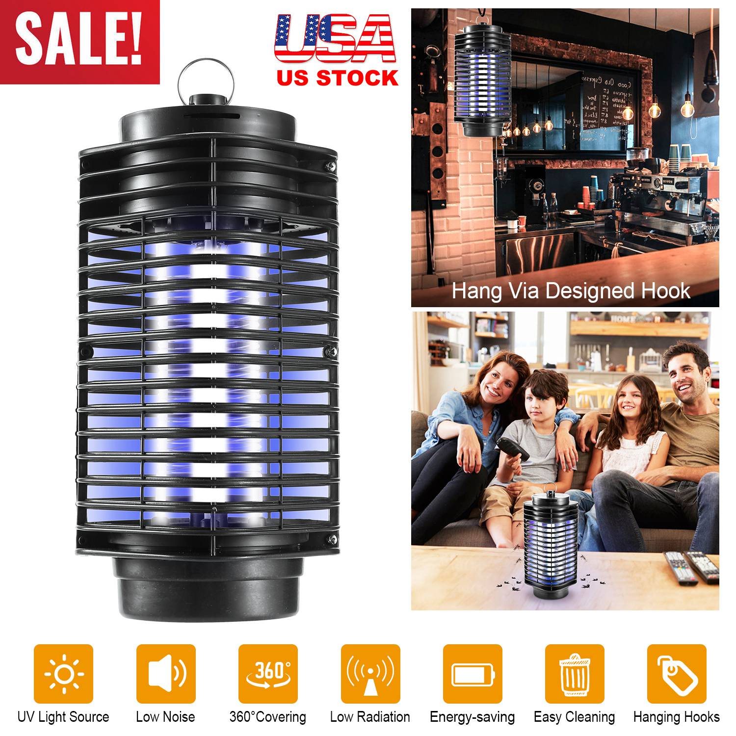 Our electronic mosquito lamp with blue UV LED can be placed in a standing position or hung from a balcony or ceiling. Insects including flies and mosquitos will be naturally drawn to the light where they will make contact with the charged aluminum alloy grid and kill to death. Electrocution is efficient and does not produce unappealing aroma and non-toxic. A protective cage prevents accidental contact from kids and pets with the electrical grid ensuring safety. The 3-5W lamp (UV light) attracts insects in the vicinity of 215 Square ft. Ideal for home, bedroom, office, kitchen, restaurant and shop, etc..