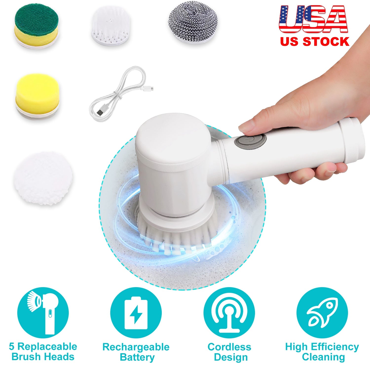 A great cleaning tool can make cleaning much more effective, easier and lower time-consuming. Adopt up to 12000RPM powerful motor, our cordless spin scrubber helps you to get rid of cable restrictions, further improve cleaning speed and achieve efficient deep cleaning. Built-in rechargeable battery supports up to 120minutes continuous working after about 1hour fully charged. Come with 5 different removable brush heads, portable electric cleaning brush meets your different cleaning needs and deeply reach every unattainable corners. Ideal helper to save you from tired, time-consuming and laborious housework.