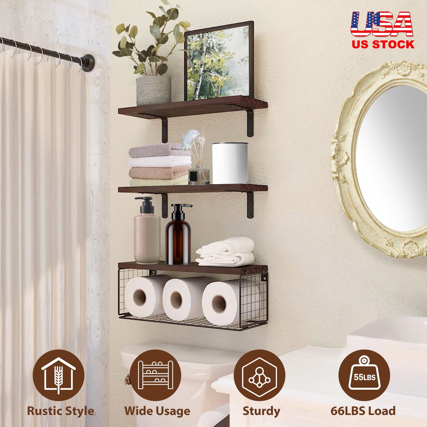 2 In 1 Floating Shelves Wall Mounted with Storage Basket Bathroom Shelves Over Toilet Wooden Shelves for Bedroom Living Room Kitchen Office Wall Decor