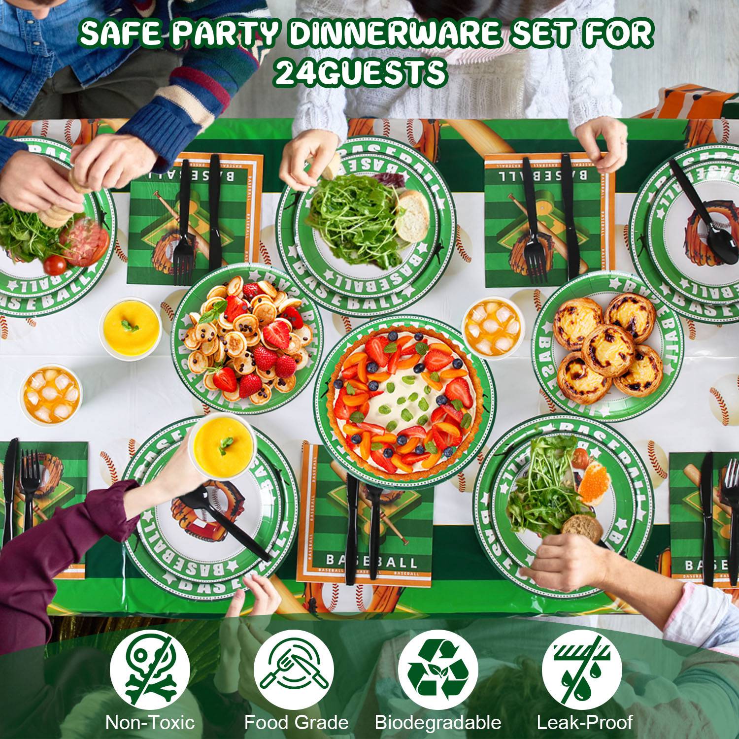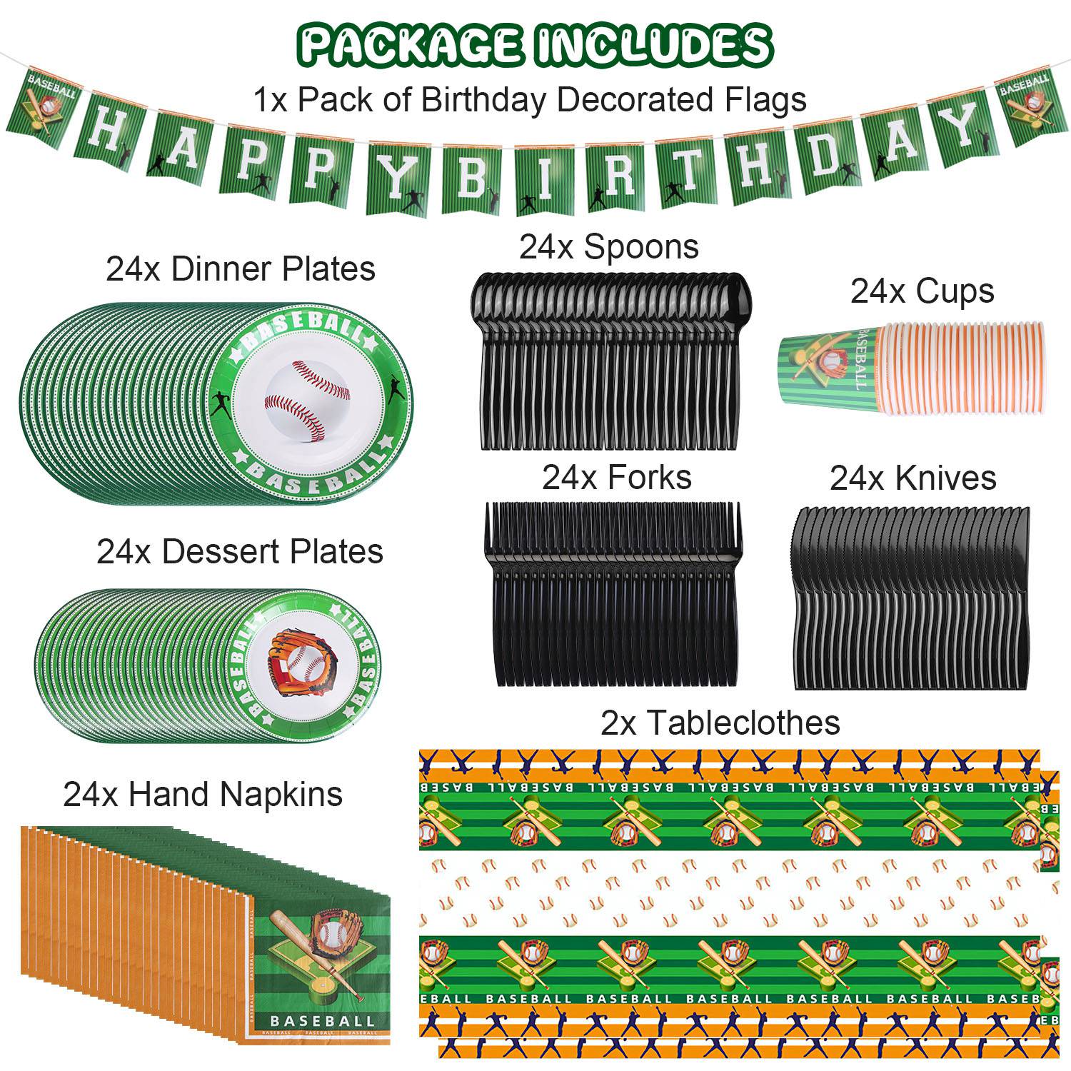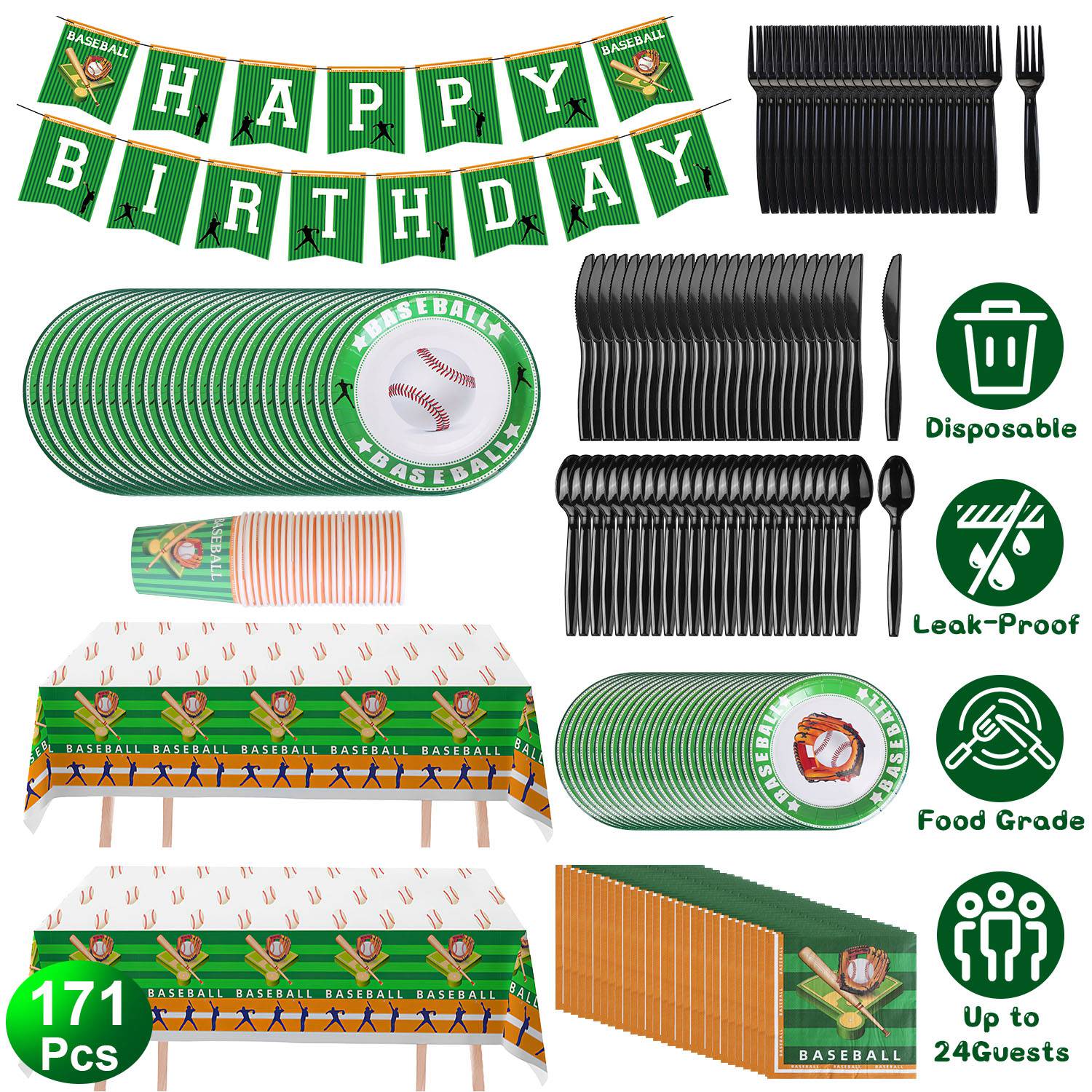 Our baseball party supplies set is designed with classic baseball patterns, adding enthusiastic, energetic and vibrant atmosphere for your various party. Food-graded thickened plastic and paper material has reliable strength and durability, wonÕt break or leak easily. 171Pcs Complete baseball themed tableware set includes all essentials to serve for up to 24 guests. A perfect choice to save your time and effort from laborious after-party cleaning jobs.