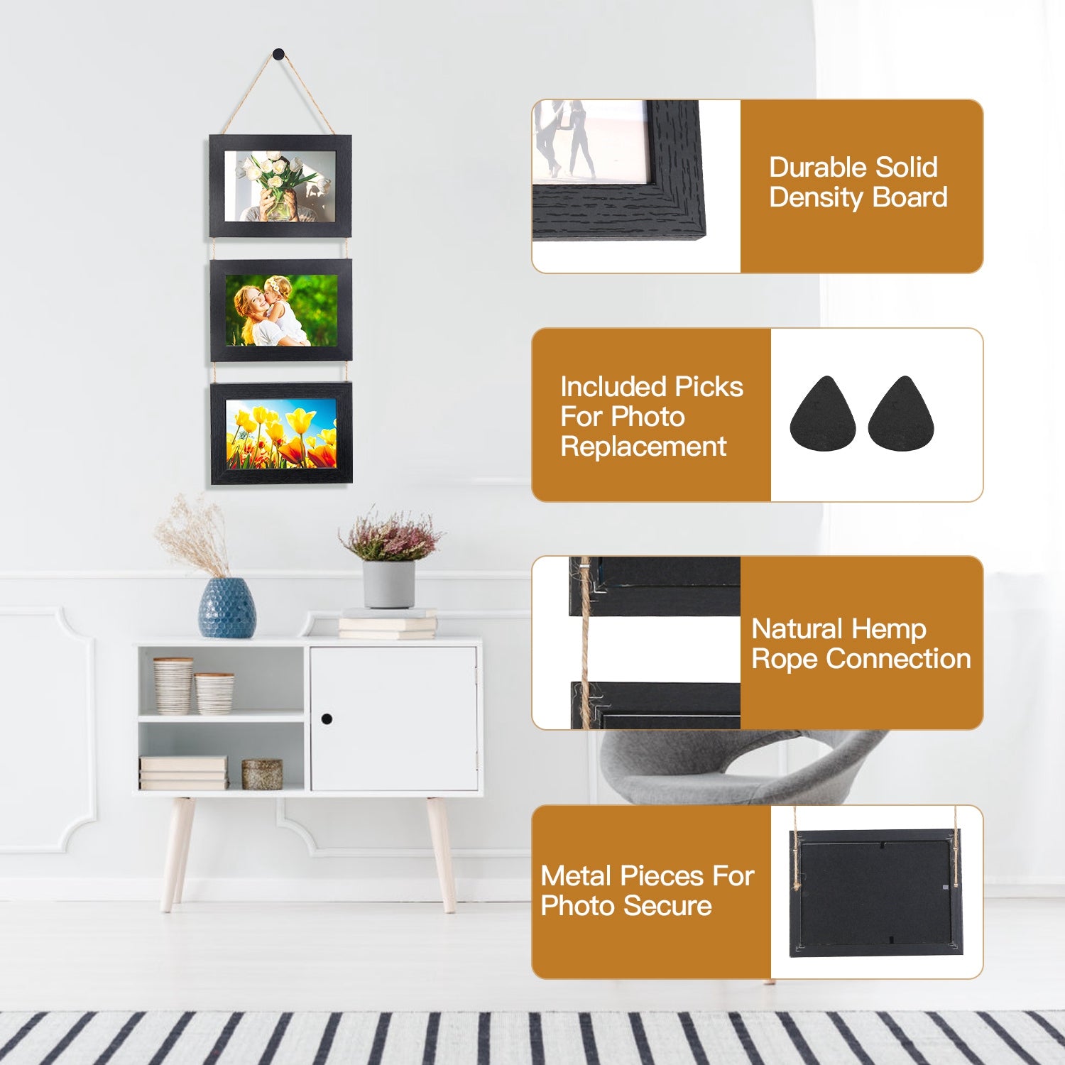 Our rustic style hanging picture collage frame come with white, black and old white different colors, can perfectly match various decoration styles. Measuring 6.88x20.27in, this 3-opening photo frame for wall decor fits for 4x6in collages, illustration, slogan and so on. Made of solid density board and natural rope, ensure durable construction and enduring lifespan. Through the high-definition pixelglass, you can appreciate the precious memories and valuable moments rather than leaving them getting dust in dark drawers.