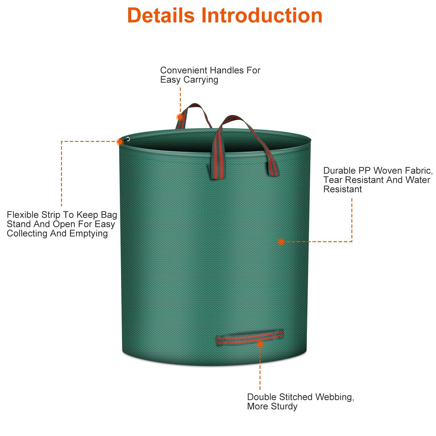 Made of durable PP woven fabric, tear resistant and water resistant, our garden waste bags are suitable for collecting weeds, grass clippings, as well as your home items. Four sturdy carrying handles provide much portability. Just put the flexible hoop into the bag opening mouth to support the lawn bag for easy collecting and emptying leaves and other yard debris.