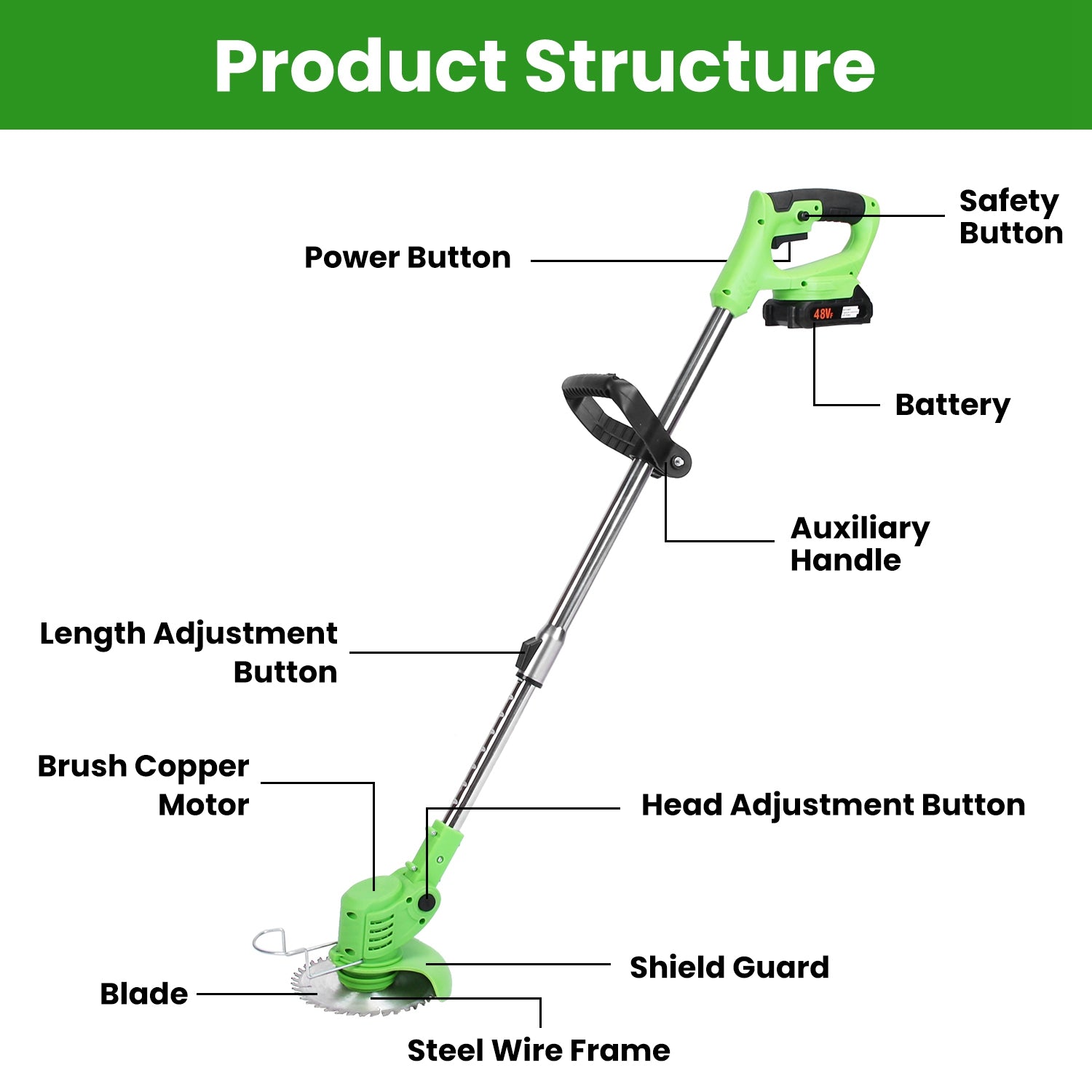 Ready to transform your lawn care routine with effortless efficiency? With 2Pcs 1500mAh rechargeable battery and built in 300W powerful motor, our cordless grass trimmer runs 60 minutes for continuous use and offers 18000m/min no-load speed. Cordless and rechargeable, say goodbye to cumbersome cords. Feature 34.65-48.82in adjustable length and tiltable head for far or hard to reach corners. Easy to install and operate. Provide 1pc saw blade for crop and bush cutting, 2pcs stainless steel blades for bush and thick grass pruning, and 10pcs plastic blades for lawn mowing. Suitable for various lawn trimming of family farms, garden, yard, etc..