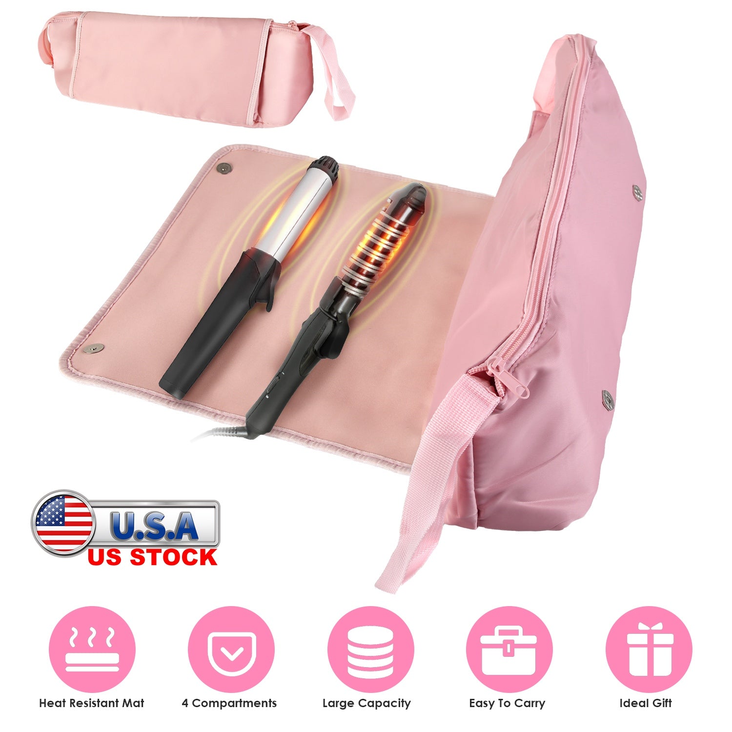 The hair tools travel bag holds all your daily hair care accessories including flat irons, curling irons, hair straighteners, brushes, curling wands, and other styling tools. Feature a heat-resistant mat which shields against scorch marks and damage. Have 1 large pocket for curling irons, 1 zipper pocket, 2 open pockets, and 3 elastic straps, perfectly storing hair ties, pins, clips, bands, and more. Easy to carry. An ideal gift for wife, lover, colleague, friends and neighbors!