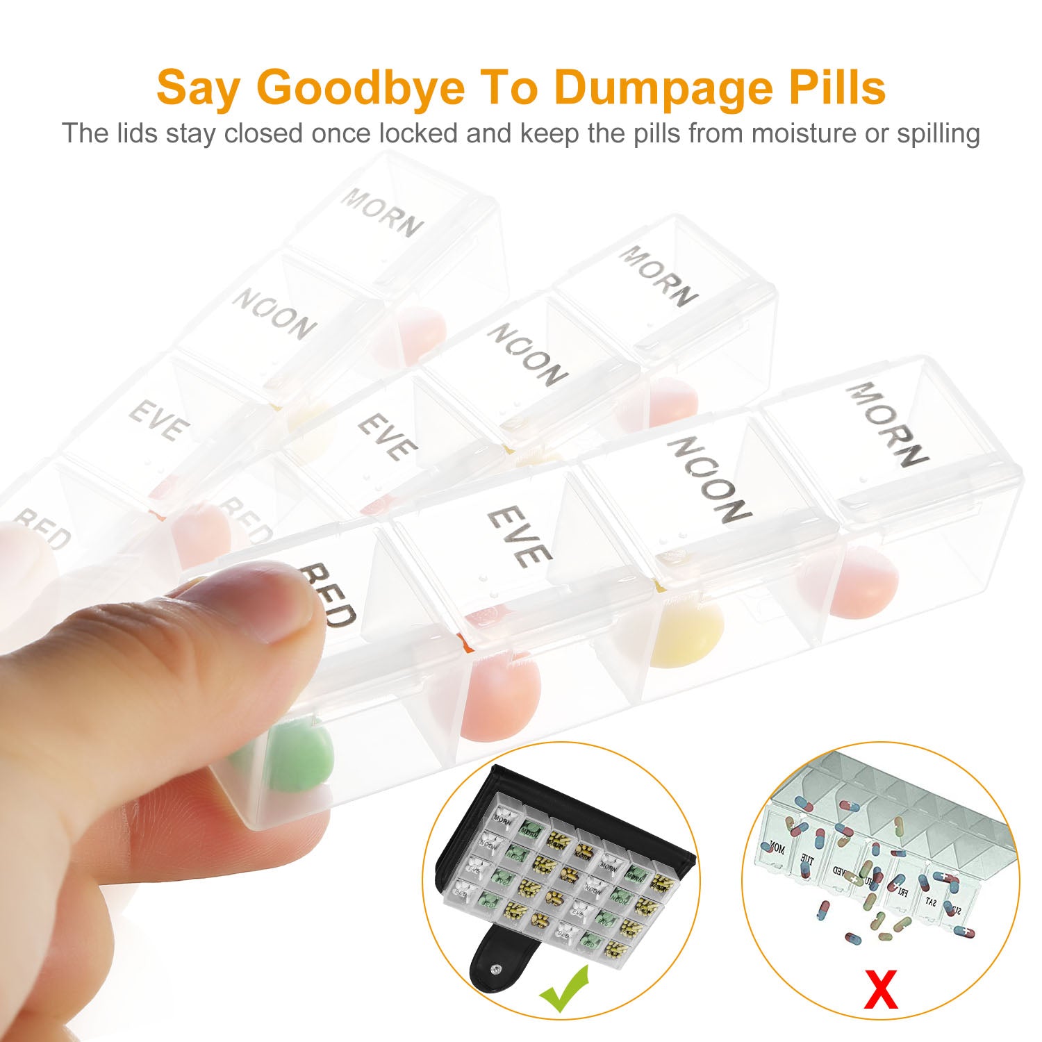 Our weekly pill organizer features lightweight and portable, which make it good for easy carrying during traveling, business trip or any outdoor activities. There are 28 separate compartments constructed with BPA-free material, and clearly visible lid, which help remind you to take medicine accordingly. It can store 7 days of pills at once and ensure you have more than enough medicine to last during your traveling, business trip, outdoors, etc. Moreover, our weekly pill organizer features moisture-proof, which can keep vitamins, medication or supplements safe from damaging moisture and oxidation.