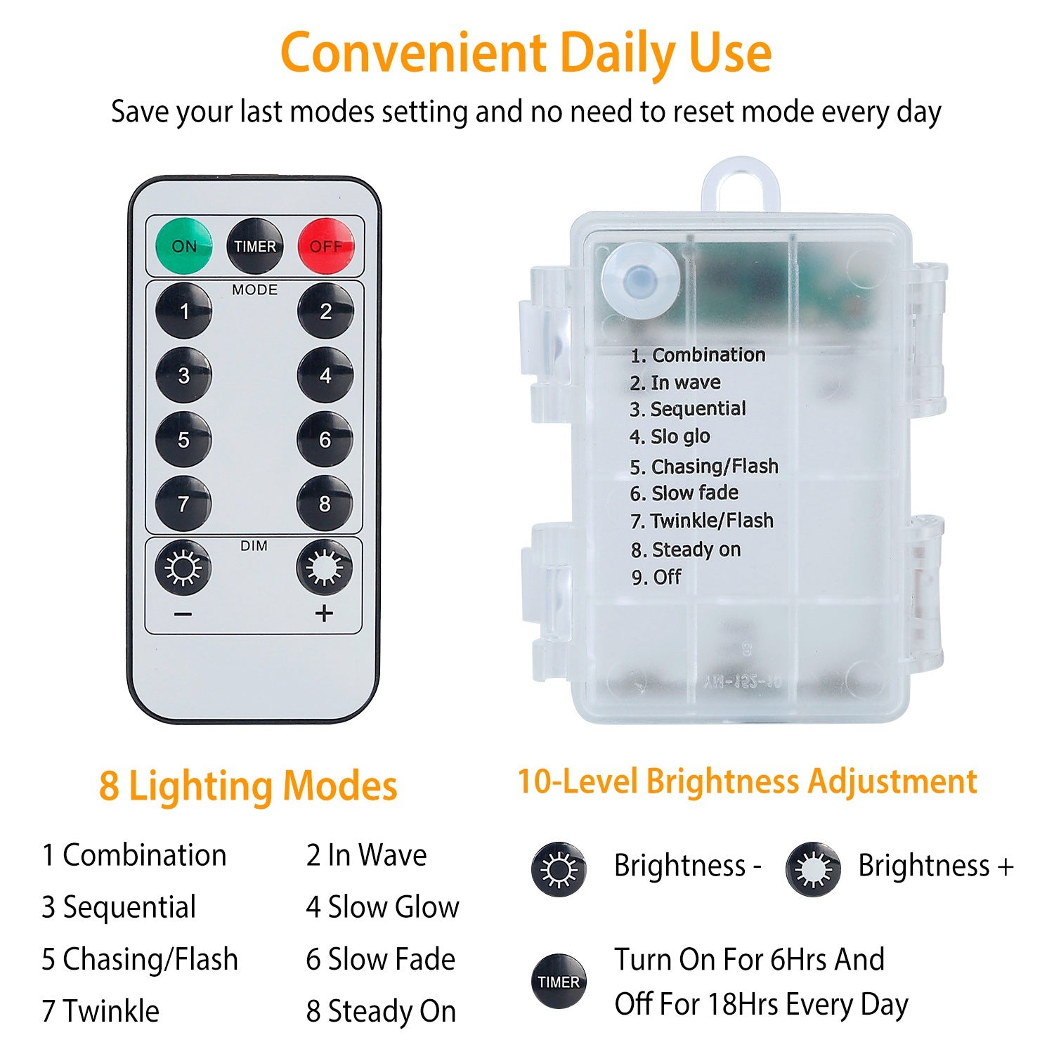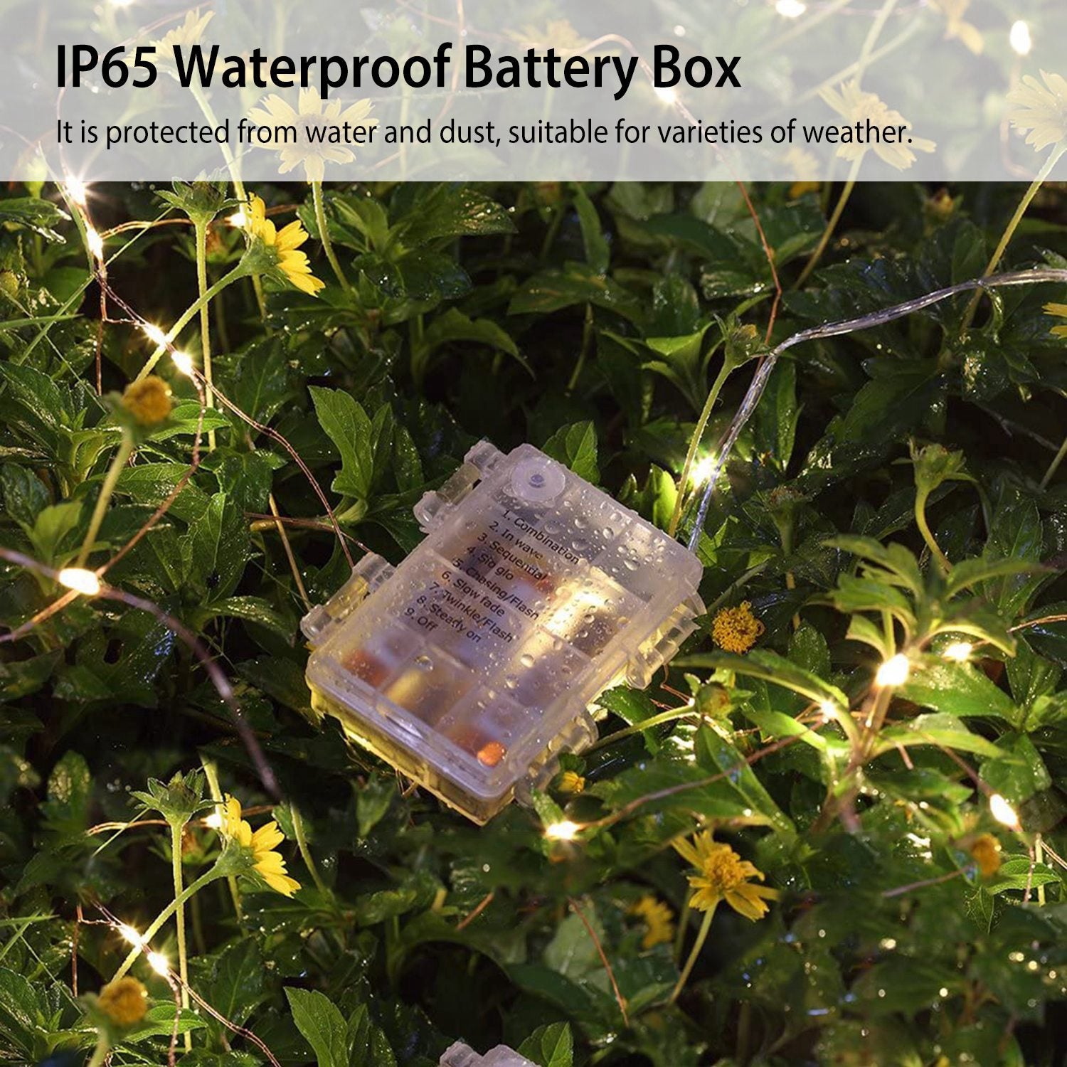 Our LED string lights have 8 modes to fit for your wedding ceremony, dinner party and crafting project. With a remote control, it is very convenient for you to set work time, choose lighting mode, adjust lighting brightness and so on. The fairy lights will automatically turn on for 6hrs and off for 18hrs every day, no need to operate it every day. Built-in memory chip makes you no need to set your favorite mode every time. It is IP65 waterproof, so no worry about it in a rainy day.