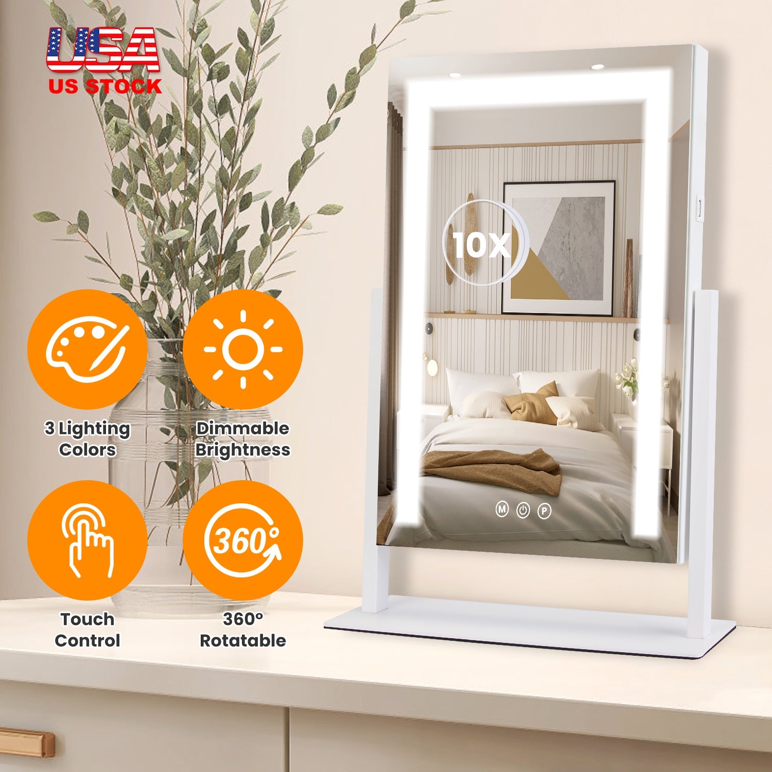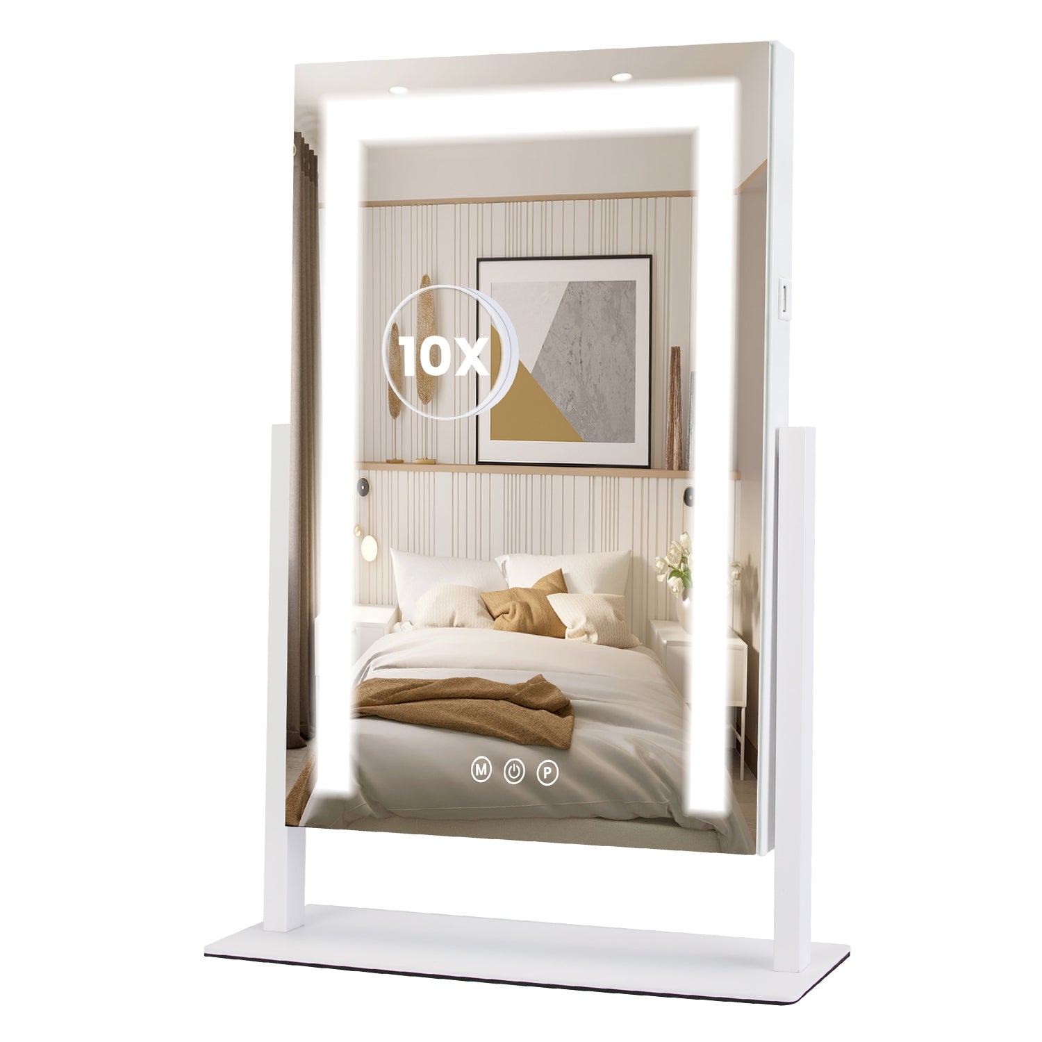 A simple and stylish vanity mirror widely used in living room, bedroom, dressing room and various spaces. With a 15.74*11.81in large mirror surface, this lighted makeup mirror provides a comprehensive view for upper body while included 10X magnifying mirror helps you with intricate tasks like applying contact lenses and grooming eyebrows. 3 Light colors and dimmable brightness match different lighting scenarios for optimal makeup effects. 360¡ rotatable design enables easy adjustment of angles for better visibility. An ideal gift for your beautiful and elegant girlfriends, wife, friends and mother!