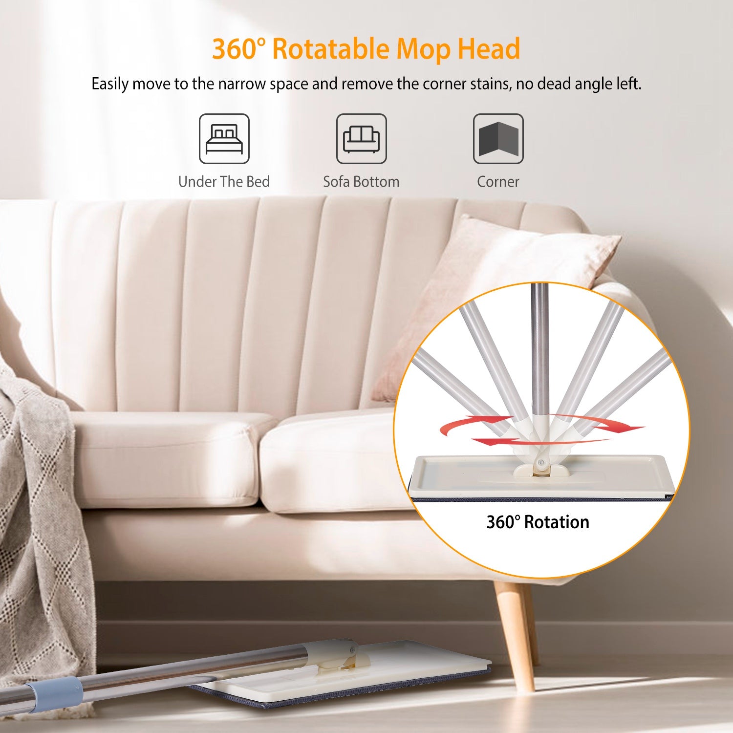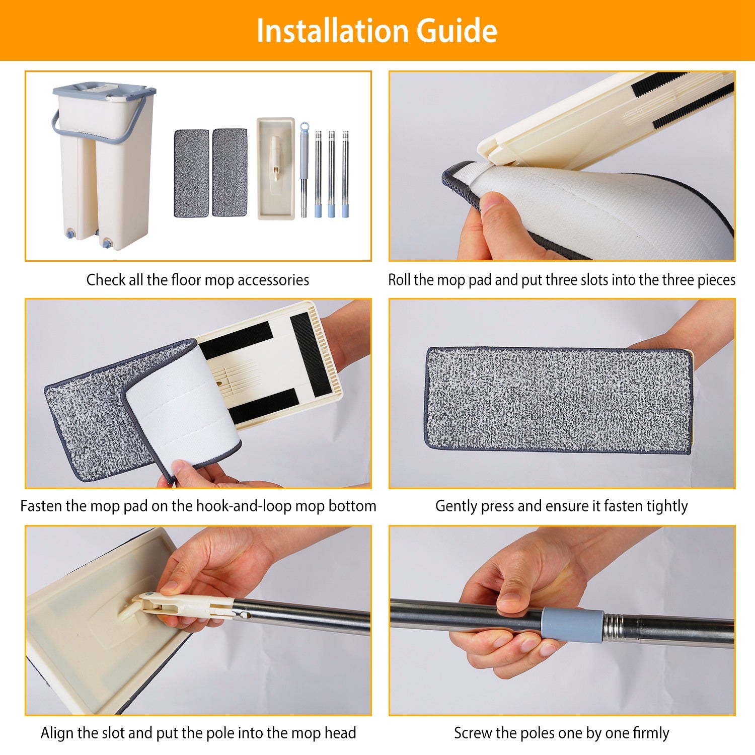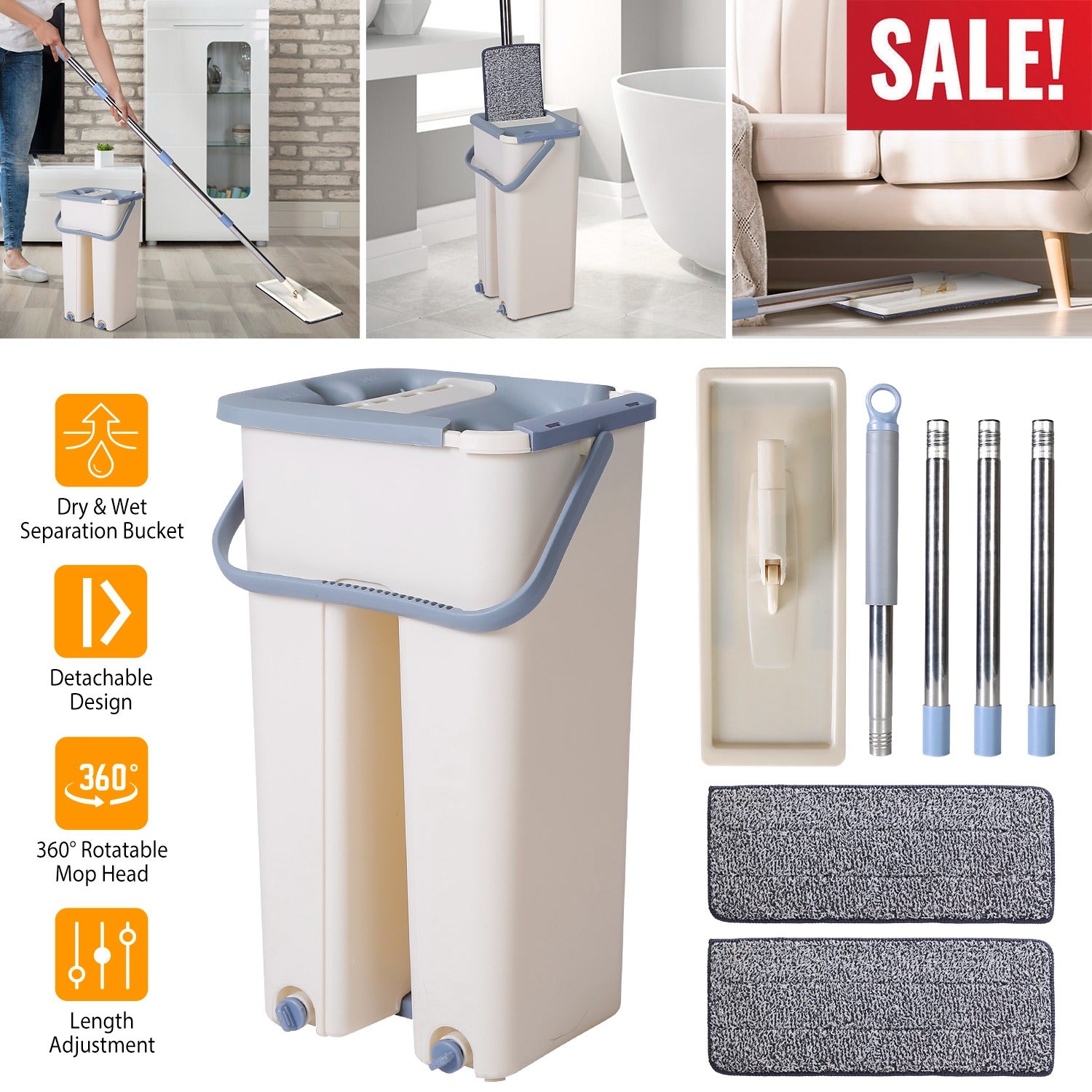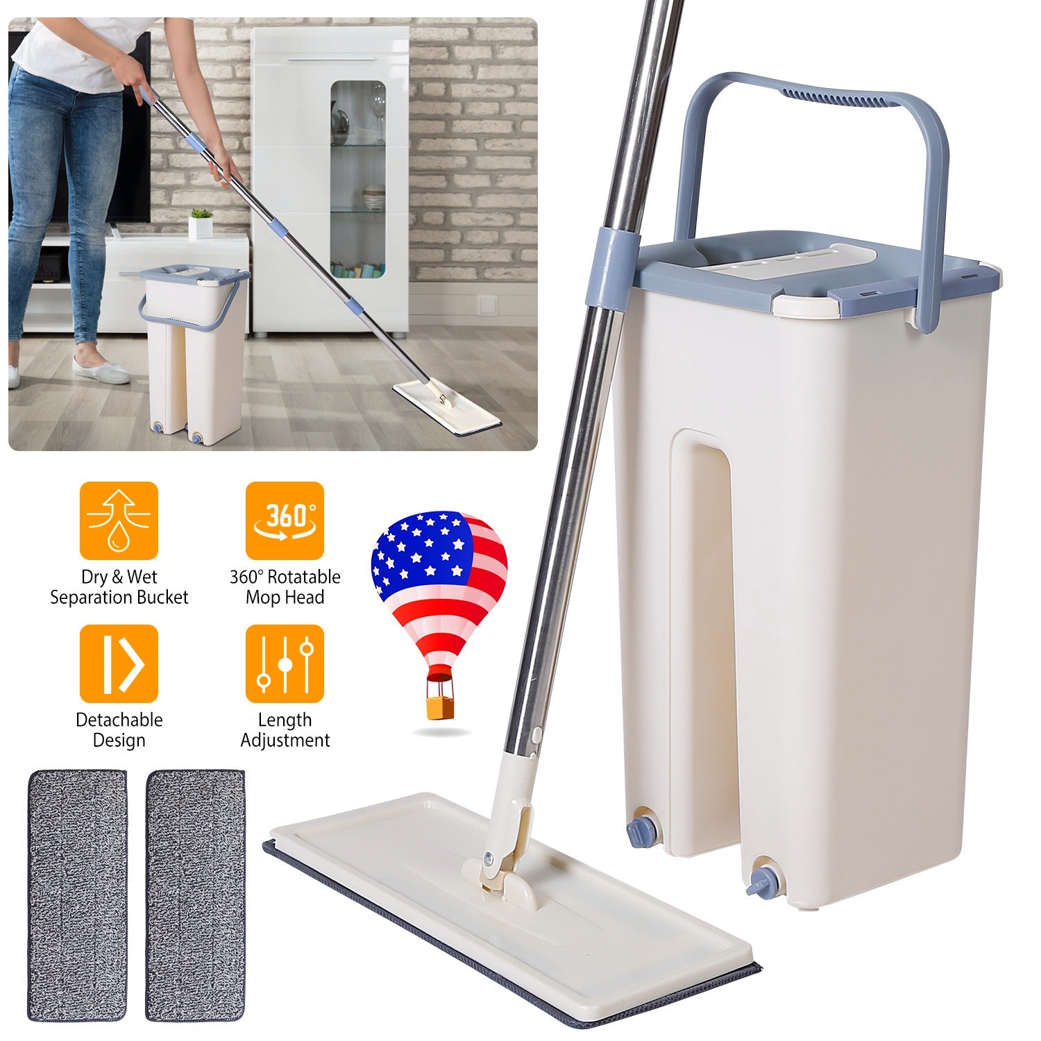 Flat Floor Mop Bucket Set Self Cleaning Wet Dry Usage with 2Pcs Reusable MicrofiberÊMop Pads