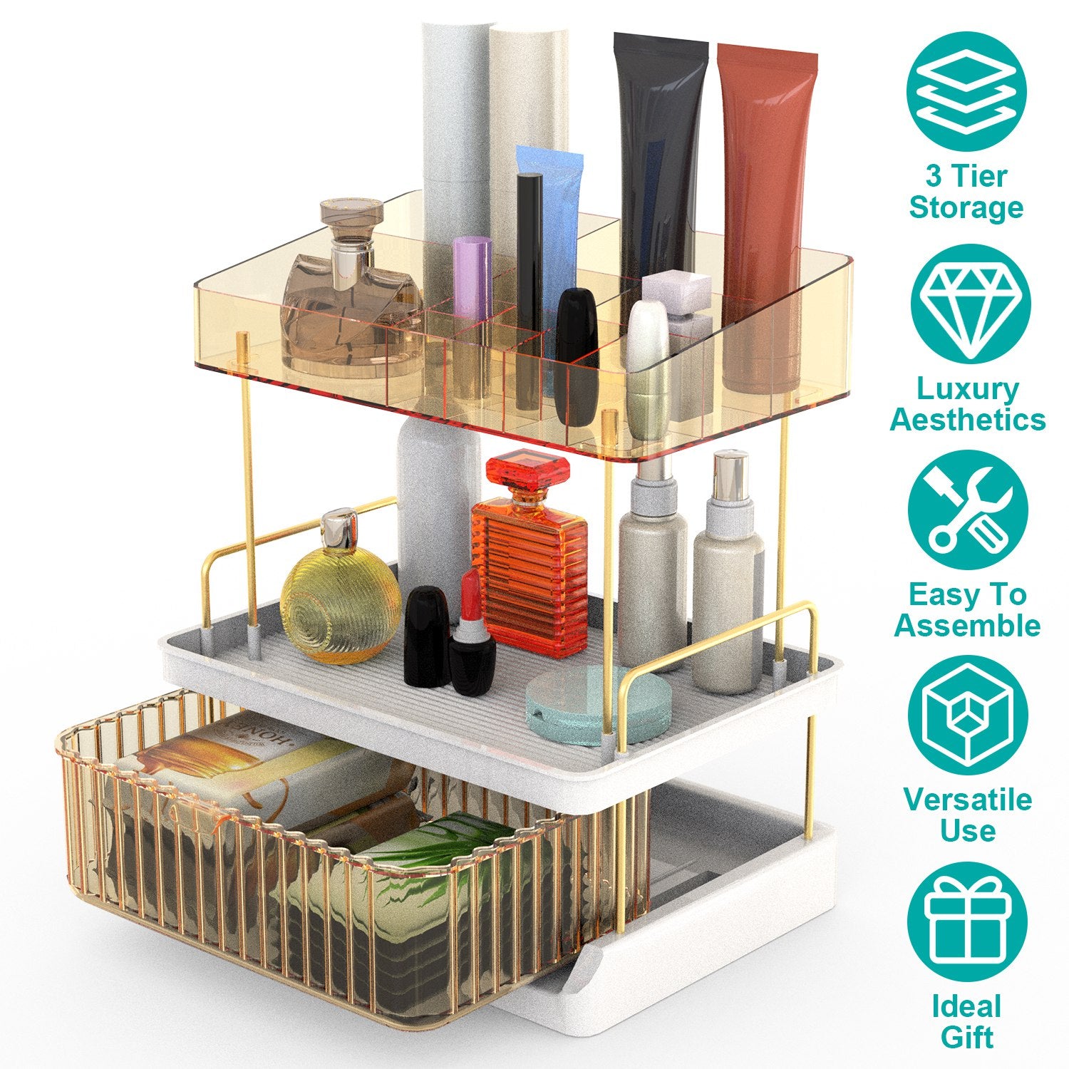 3 Tier Makeup Organizer for Vanity Large Capacity Skincare Shelf Bathroom Countertop Organizer with Drawer for Lipsticks Lotion Toner Perfumer Masks