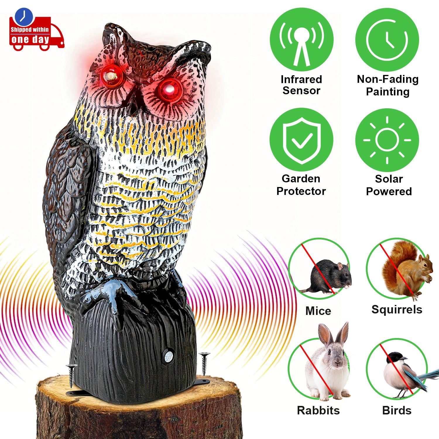 Solar Powered Owl Decoy with Flashing Eye Hoot Sound Infrared Sensor Scare Bird Squirrel Away Pest Repellent Bird Deterrent Outdoor Garden Yard Protec