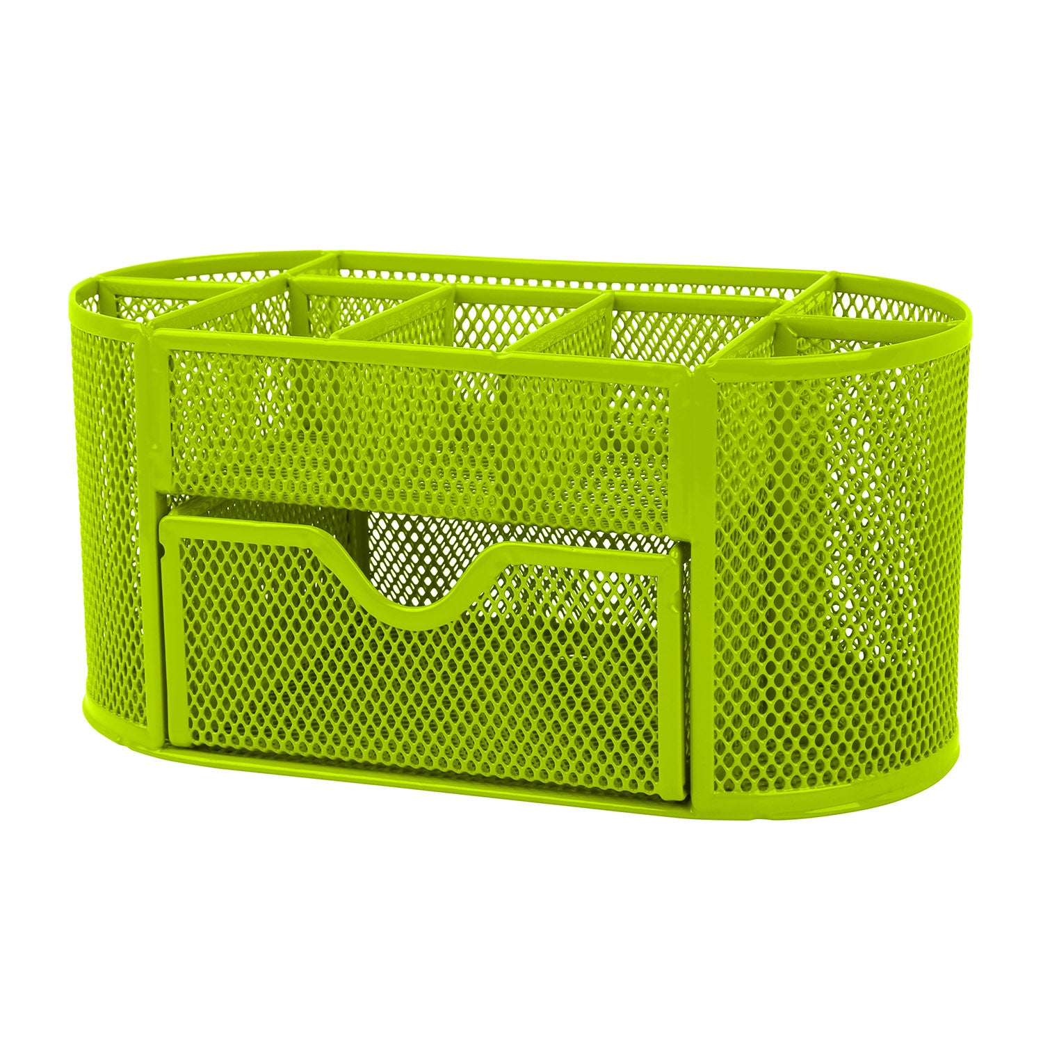 Our office desk organizer has enough space to hold your various stationeries and writing instruments. It comes with 4 pencil side cups for highlighters, pencils, pens, and sharpies, 4 additional square shallow compartments on top for thumbtacks, paper clips and sticky notes, and 1 individual supply drawer. Even it has EVA plastic materiel grips on the end that prevent it from sliding all over your desk.