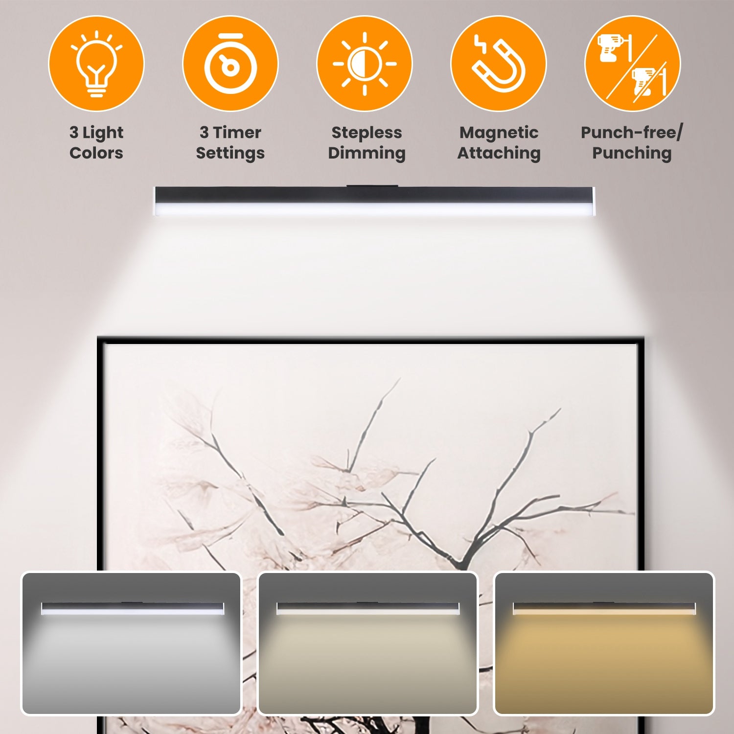 Ready to add a distinct atmosphere for your wall artwork? With 3 light colors and stepless dimming, our wireless picture light will definitely highlight your picture frame, canvas artwork, wall artworks, portraits, gallery etc., making this space more inviting. The 15Mins/30Mins/60Mins timer leaves no worries about forgetting to switch off. The cordless design makes it versatile as a bedside light, an LED makeup mirror light, a hallway light and a light for wardrobes etc.. USB rechargeable and longlasting for up to 7 hours. Come with a magnetic holder, a hook adhesive and 3 screws for punch-free or punching installation. Upgrade your display lighting and light up every place you want!