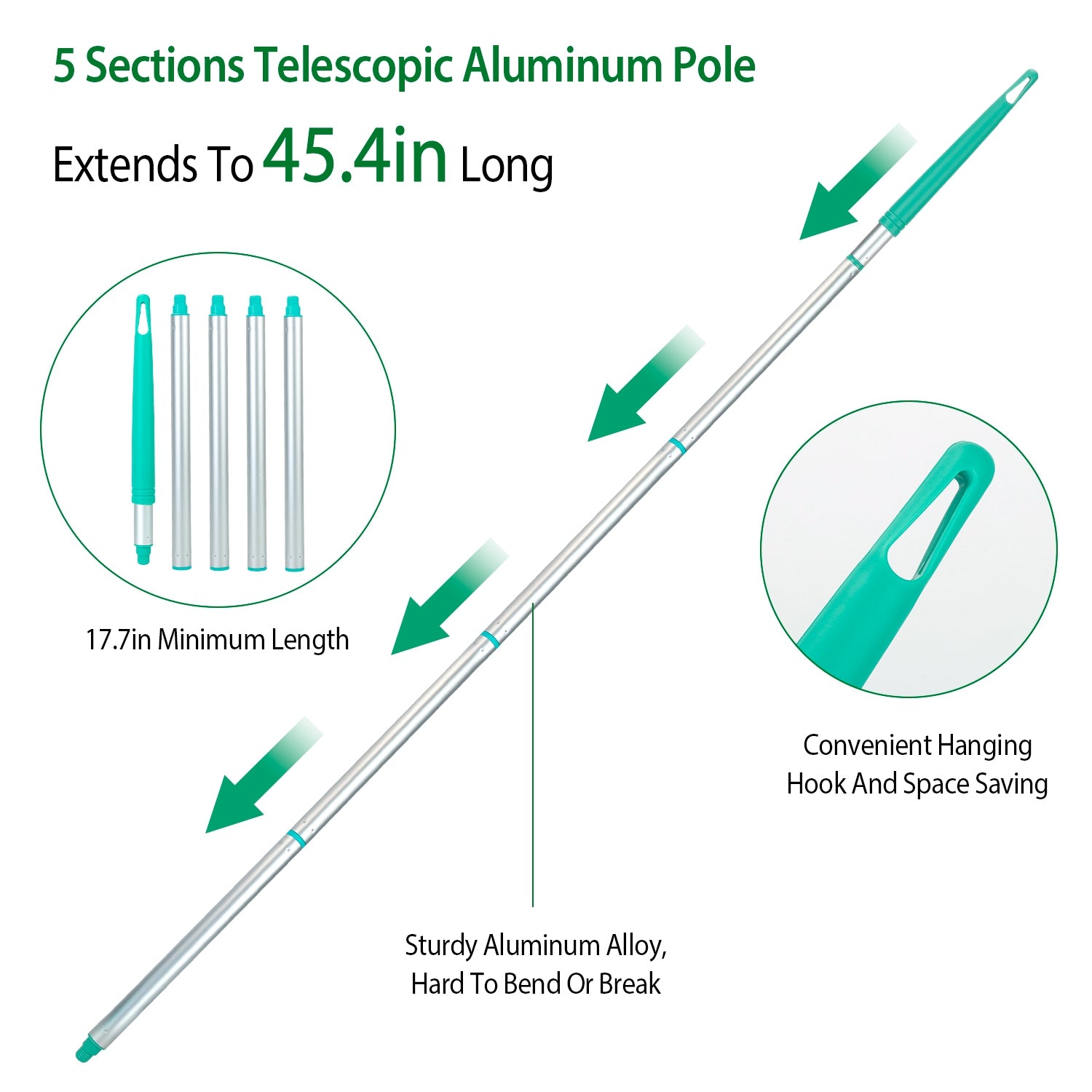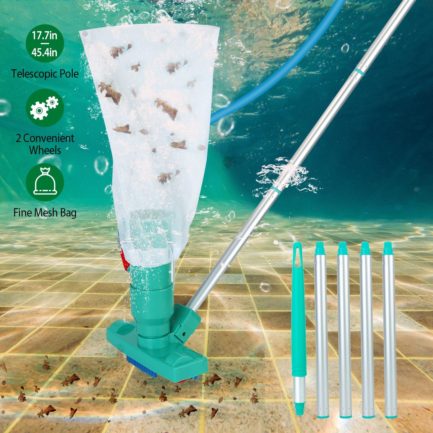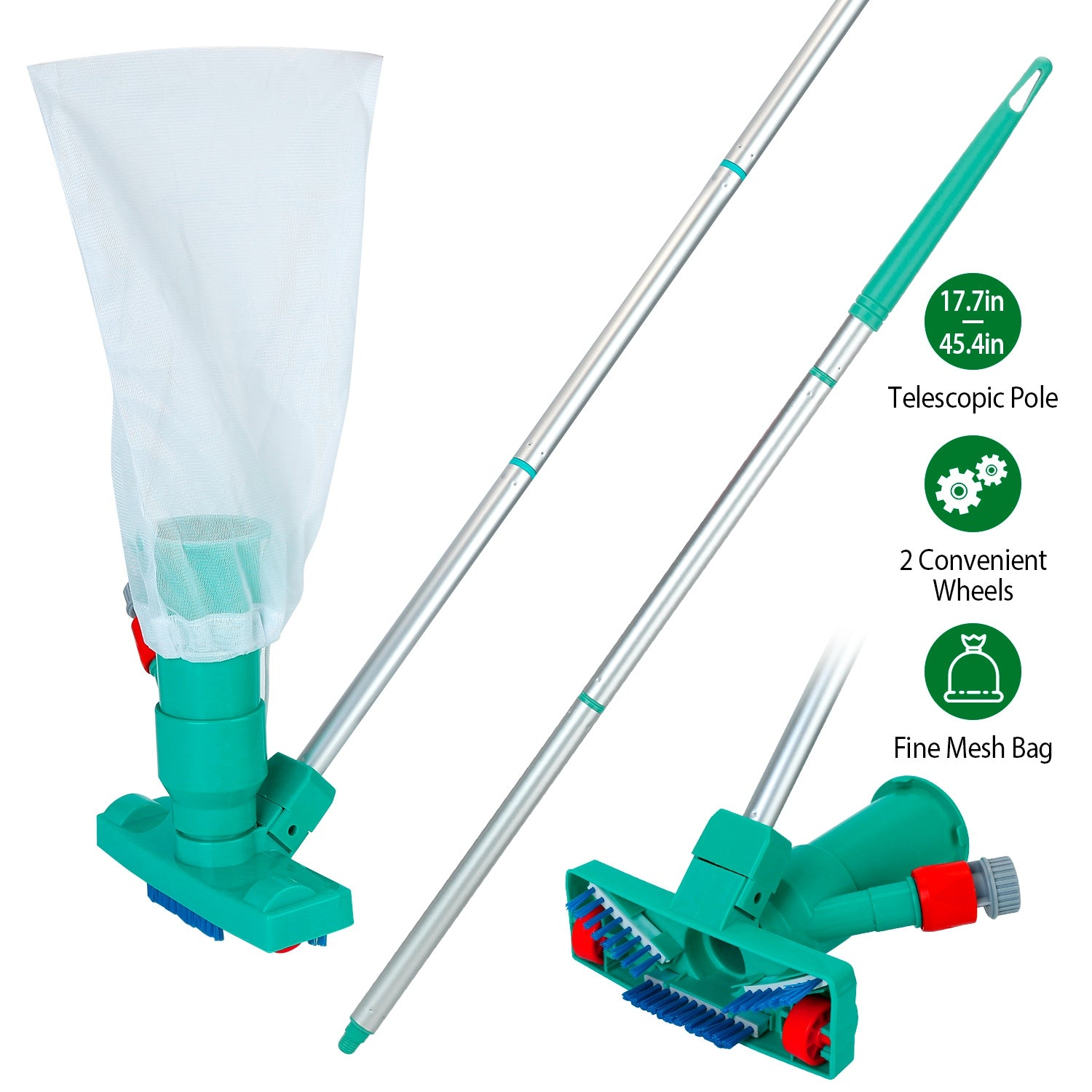 Are you troubled by the sand, leaves, mud and other dirt at the bottom of the pool? The pool skimmer net can only clean the leaves on the pool surface and the electric vacuum cleaner is too expensive. Our pool vacuum cleaner can solve your problem. Our cleaning kit works with the force of the water pressure entering into the vacuum creating suction in which then draws debris and leaves right into the mesh net. Made of hardened ABS material, it ensures the maximum durability. The pool jet vacuum cleaner is easy to assemble. No need of complex process.17.7in-45.4in Pole length meets your different needs. Perfect cleaning tools for above-ground pools, splash pools, ponds, fountains, hot springs, or water features with a radius of 1.3m/51in.