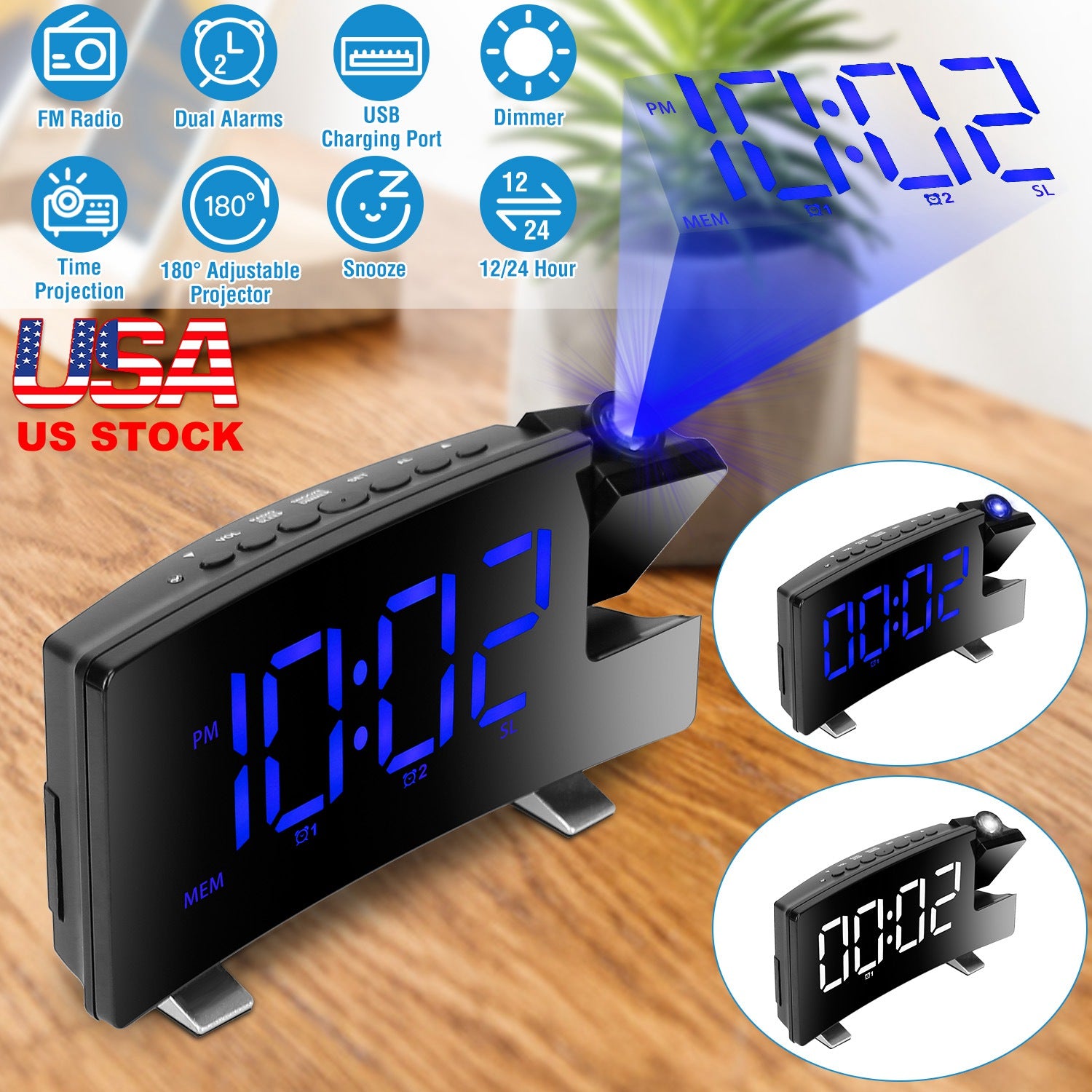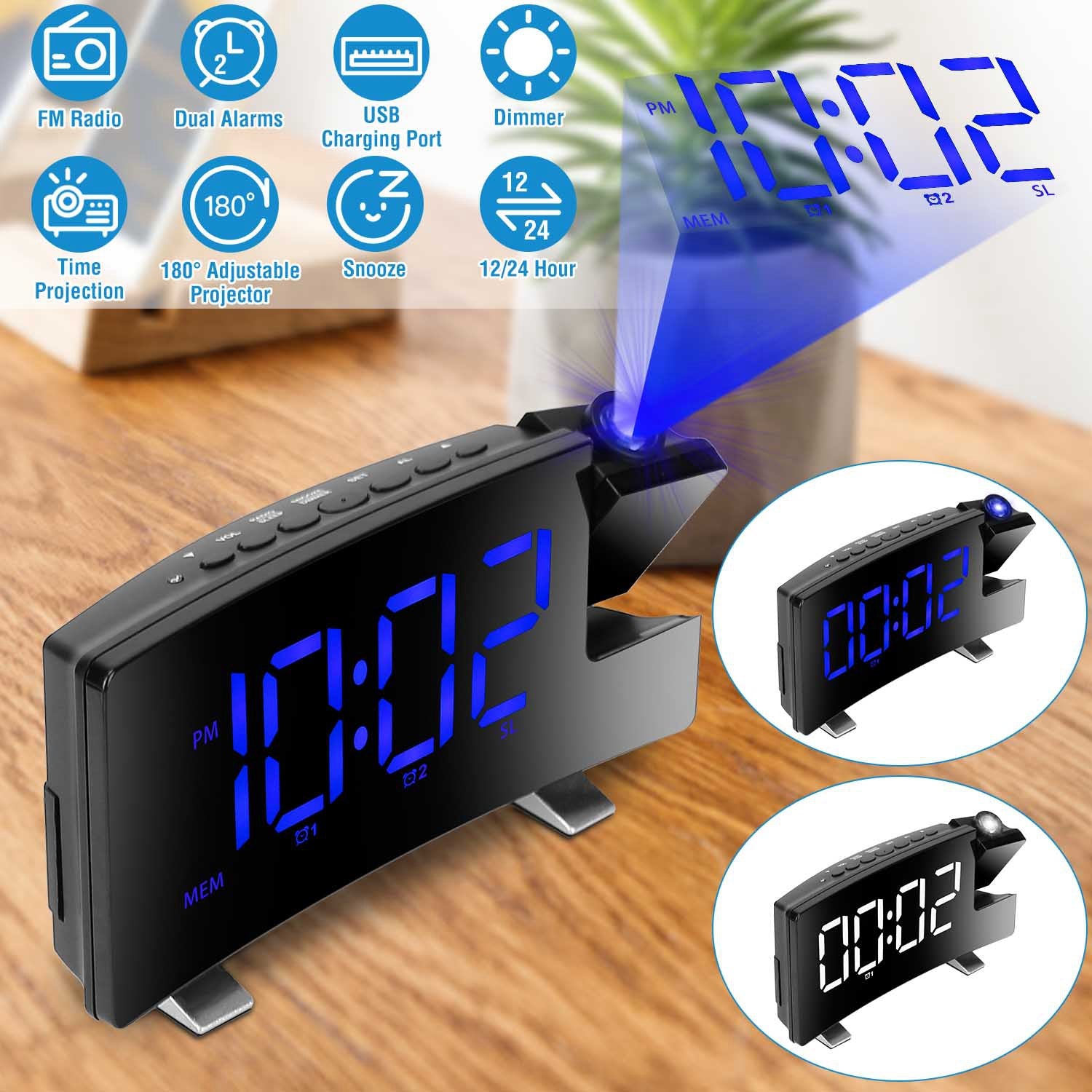 Projection Alarm Clock with Radio Function 7.7In Curved-Screen LED Digital Alarm Clock w/ Dual Alarms 4 Dimmer 12/24 Hour USB Charging Port 180¡ Rotat