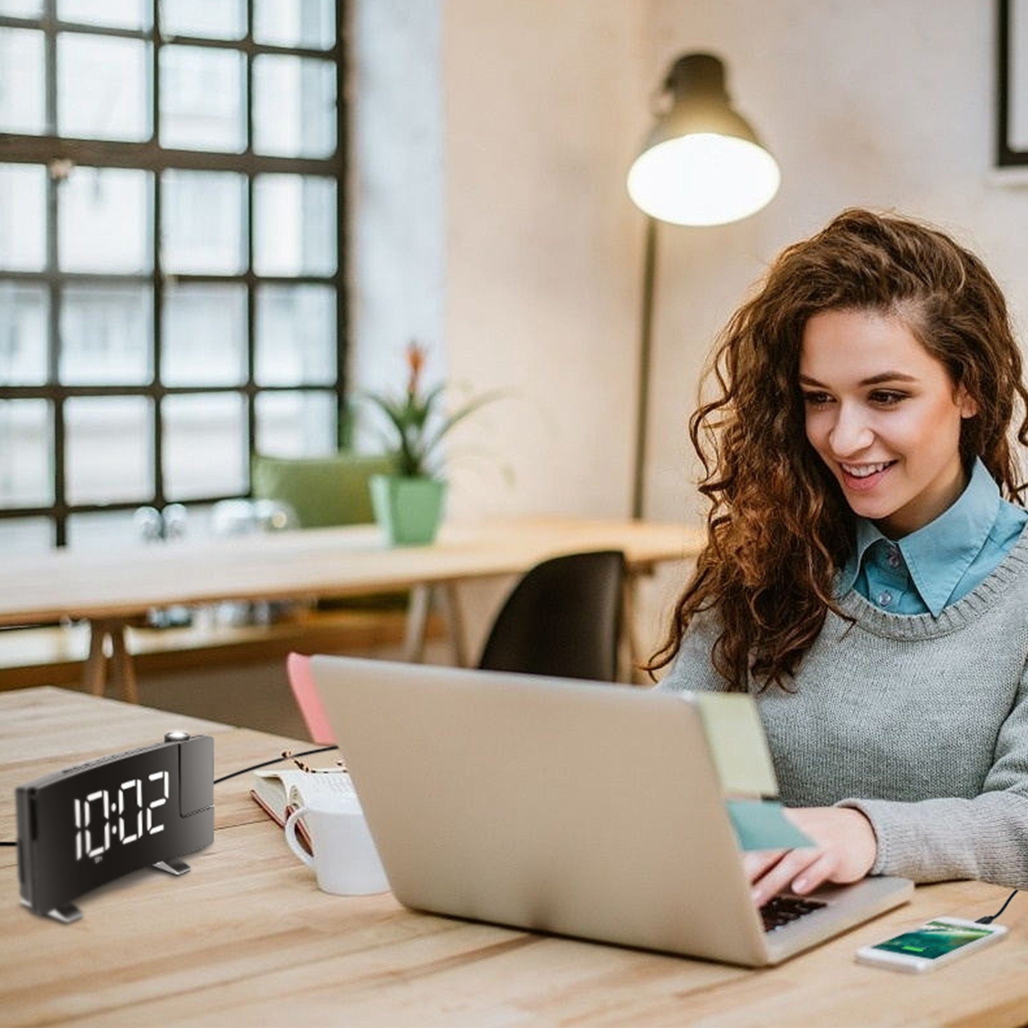 Projection Alarm Clock with Radio Function 7.7In Curved-Screen LED Digital Alarm Clock w/ Dual Alarms 4 Dimmer 12/24 Hour USB Charging Port 180¡ Rotat