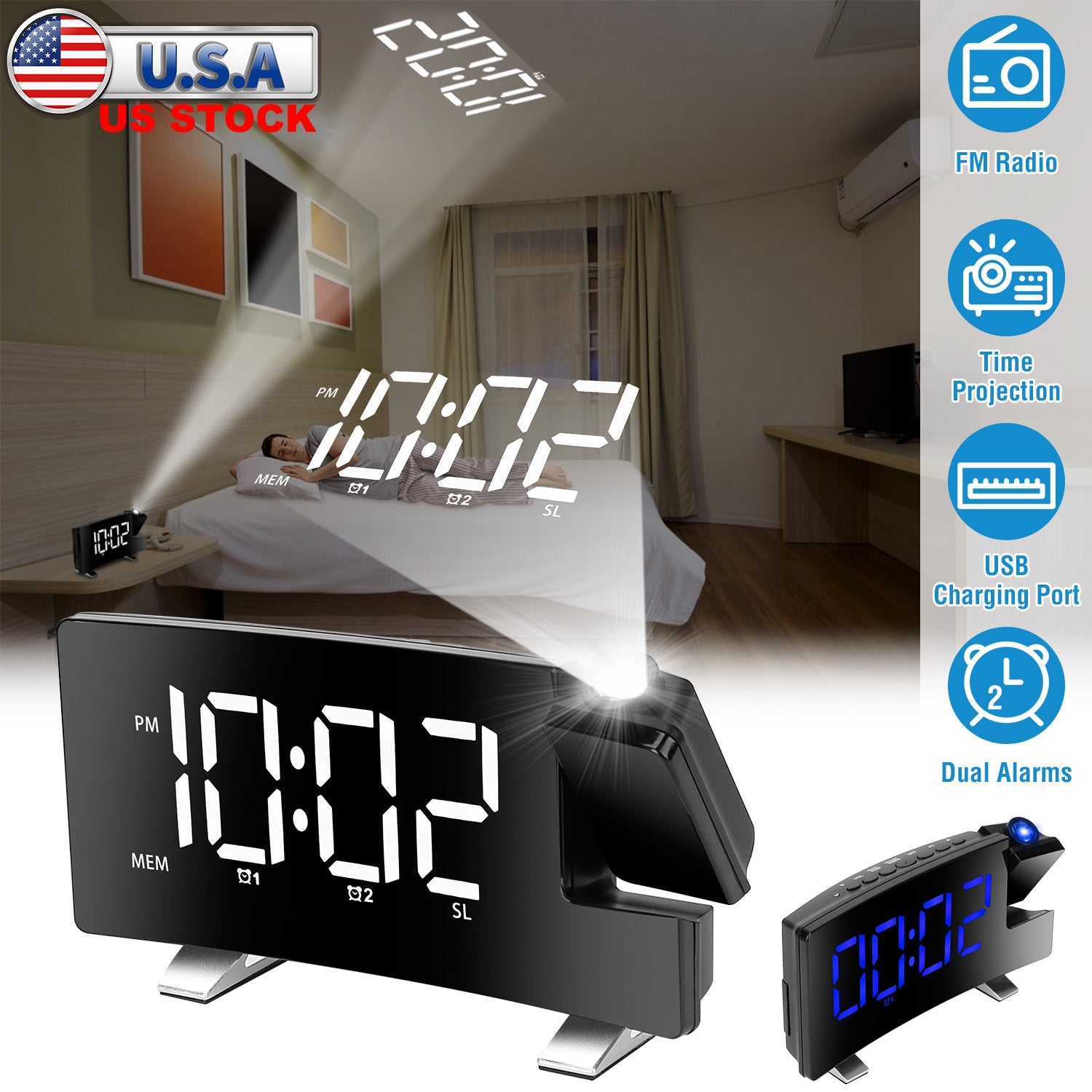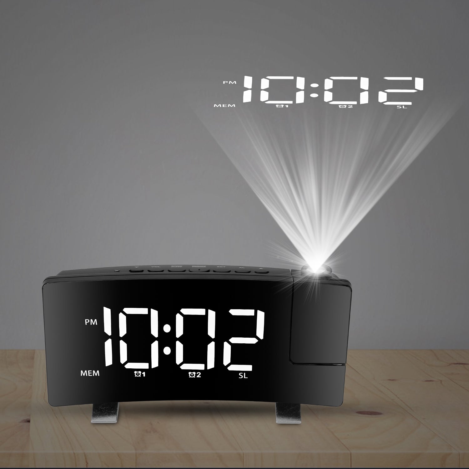 Projection Alarm Clock with Radio Function 7.7In Curved-Screen LED Digital Alarm Clock w/ Dual Alarms 4 Dimmer 12/24 Hour USB Charging Port 180¡ Rotat