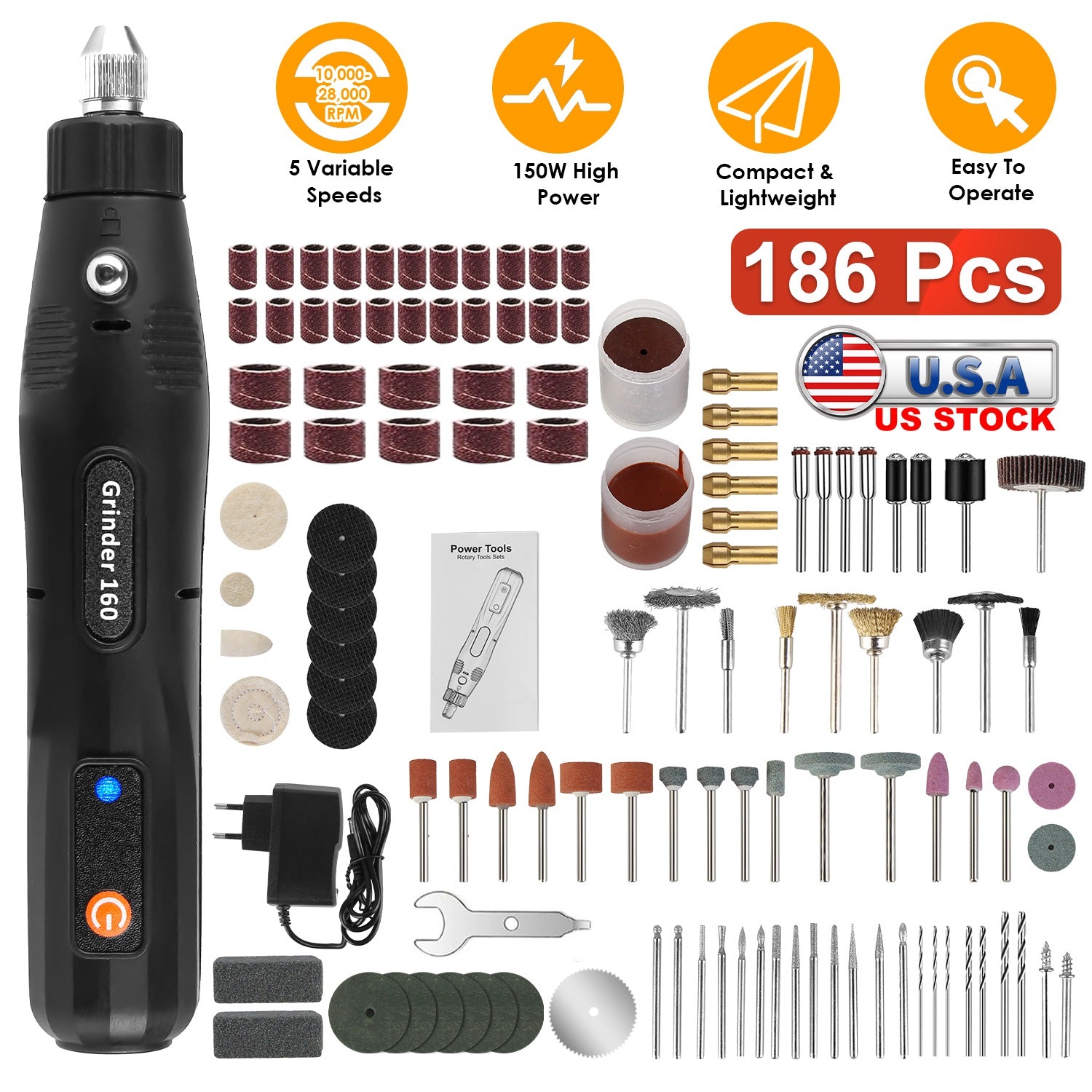 Our corded rotary tool set with 1Pc rotary tool and 185Pcs accessories including drill bits, grinding bits, polishing wheels, polishing compounds, steel and nylon brushes, cutting wheels, mandrels, etc., is a great choice for various tasks. Ideal for most material suppliers, such as softwood, hardwood, plastic, steel, and great for cleaning and polishing, drilling, engraving, cutting, grinding. It has 5 variable speeds, from 10000 to 28000RPM, great for precision work. Comes with 186Pcs accessories including, perfect for for multiple tasks. Compact (6.1x1.38x1.38in) and lightweight (0.2lbs) for easy operation and work control.