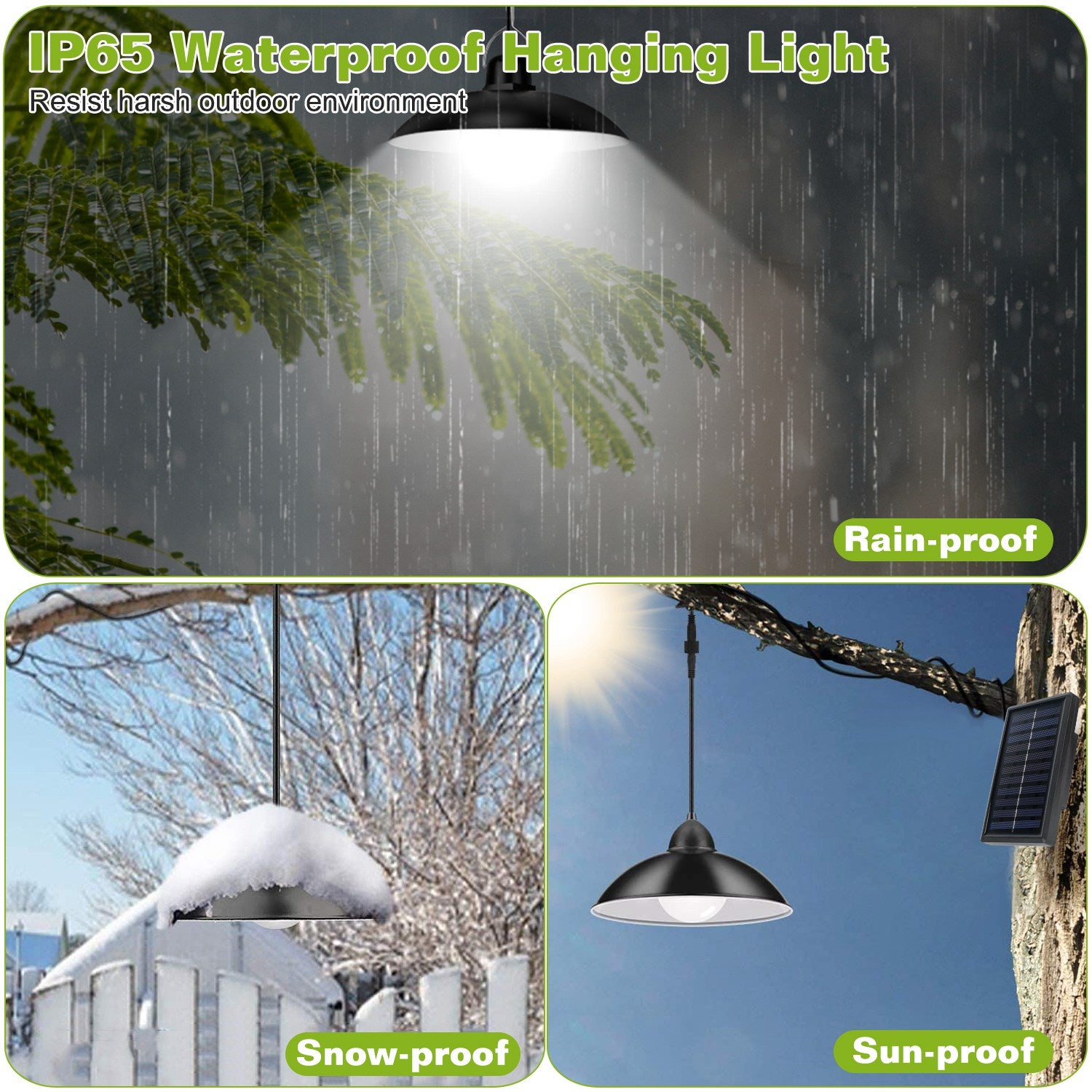 Our shed lights are controlled by a remote control, you only need to point the remote at the lamp head to operate. Light control, the hanging lamp will turn off at dawn automatically and need to turn on be pressing the power button on the remote control. When at daytime, it will charge automatically. Not need to pay the Electricity, save money! There is 3-level brightness is provided to control the light: 100%/50%/25%. It also has timer functions which can set the lights on time you need, more convenient. The shed lights and solar panel are connected with waterproof connectors for easy removal and installation, it is very easy to install with hanging hook and wall mount base.