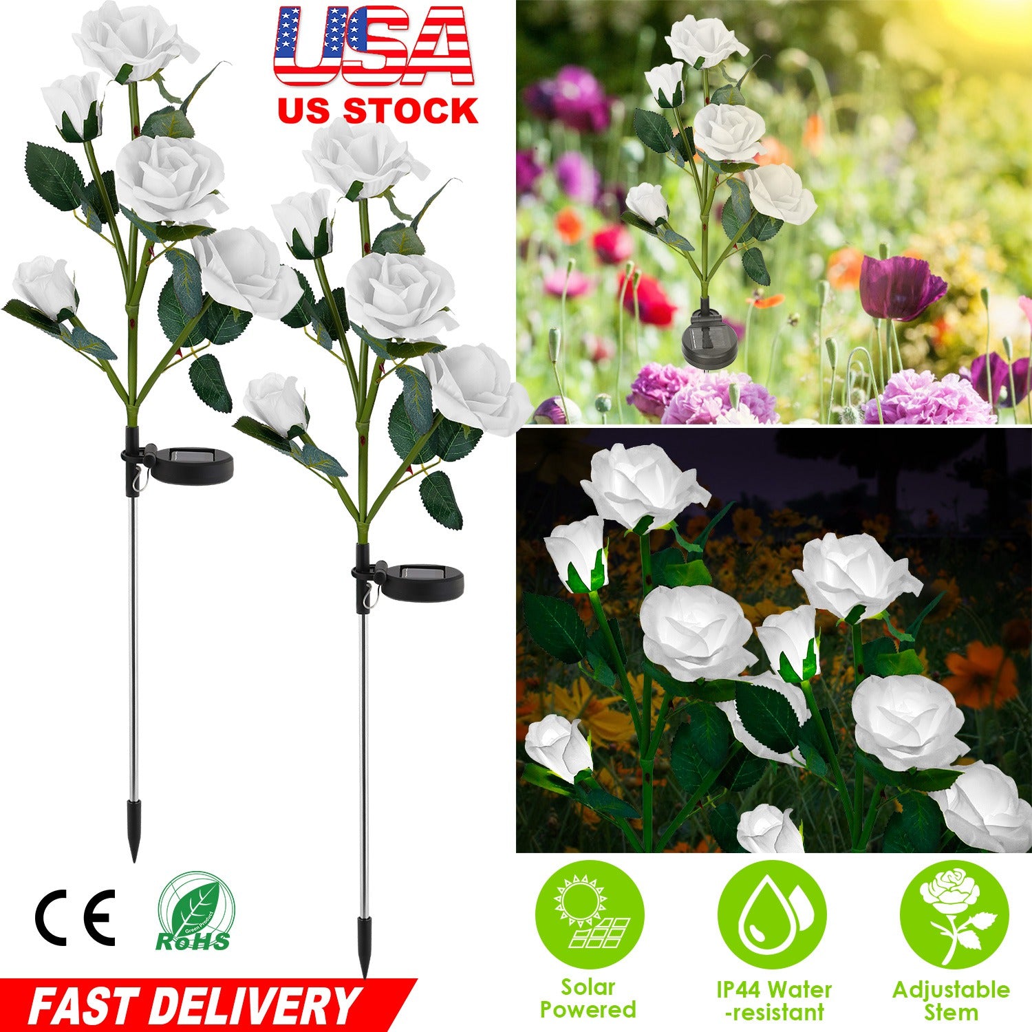 Our solar garden flower lights are vivid artificial rose lights. Their flowers petal is made of premium fabric, and exquisitely designed to imitate real rose flower, which are even look more delicate than that of real rose. Besides, their stems and leaves are propped up by ultra-flexible and durable iron wire so as to be bent into different angle and style to meet garden decoration needs. Moreover, made of high-quality stainless steel material, which is IP44 water-resistant and weather-resistant and able to survive heat, rain, cold and frost.