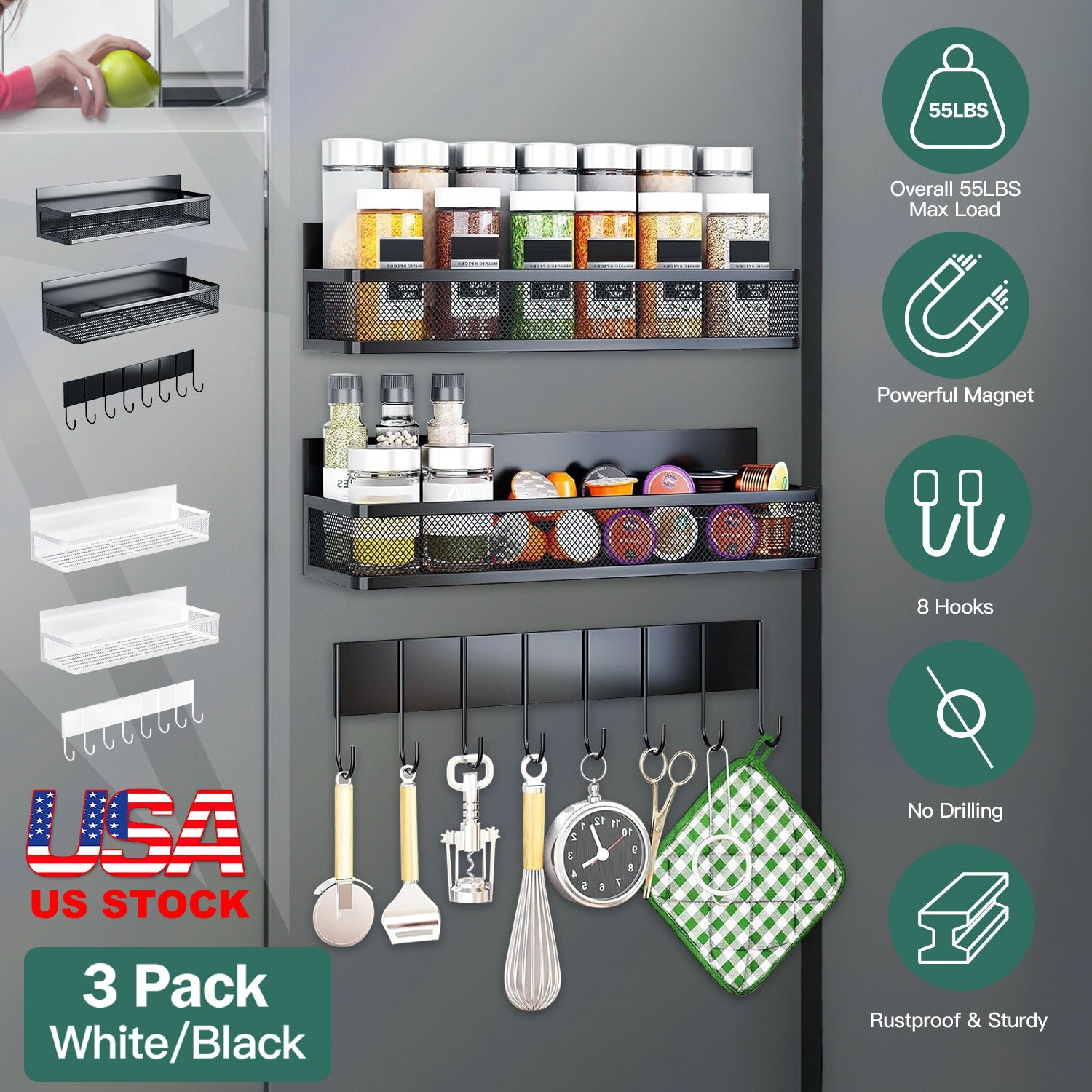 3 Pack Strong Magnetic Spice Rack with 8 Hooks Fridge Oven Microwave Magnetic Storage Shelves Seasoning Holder Organizer for Jars Seasoning Tins Utens