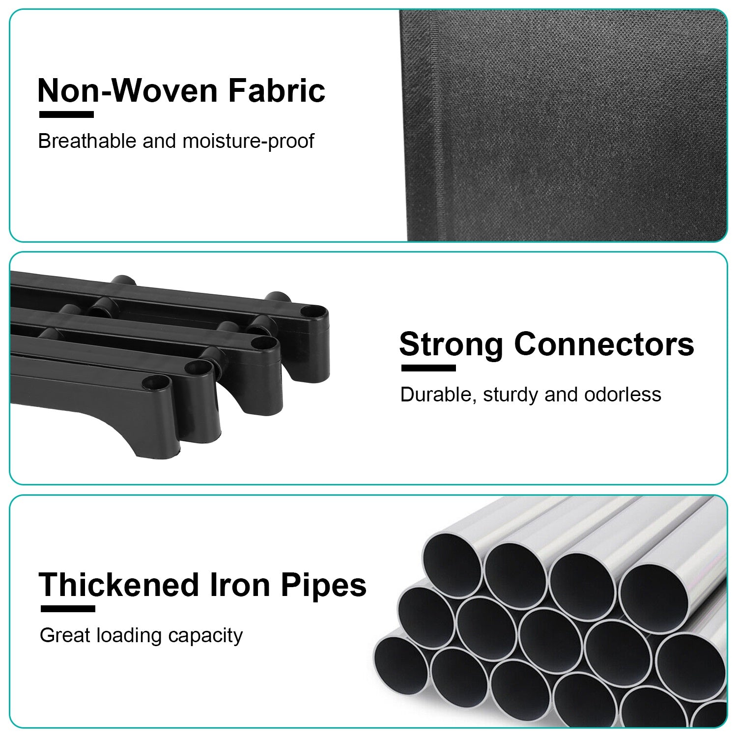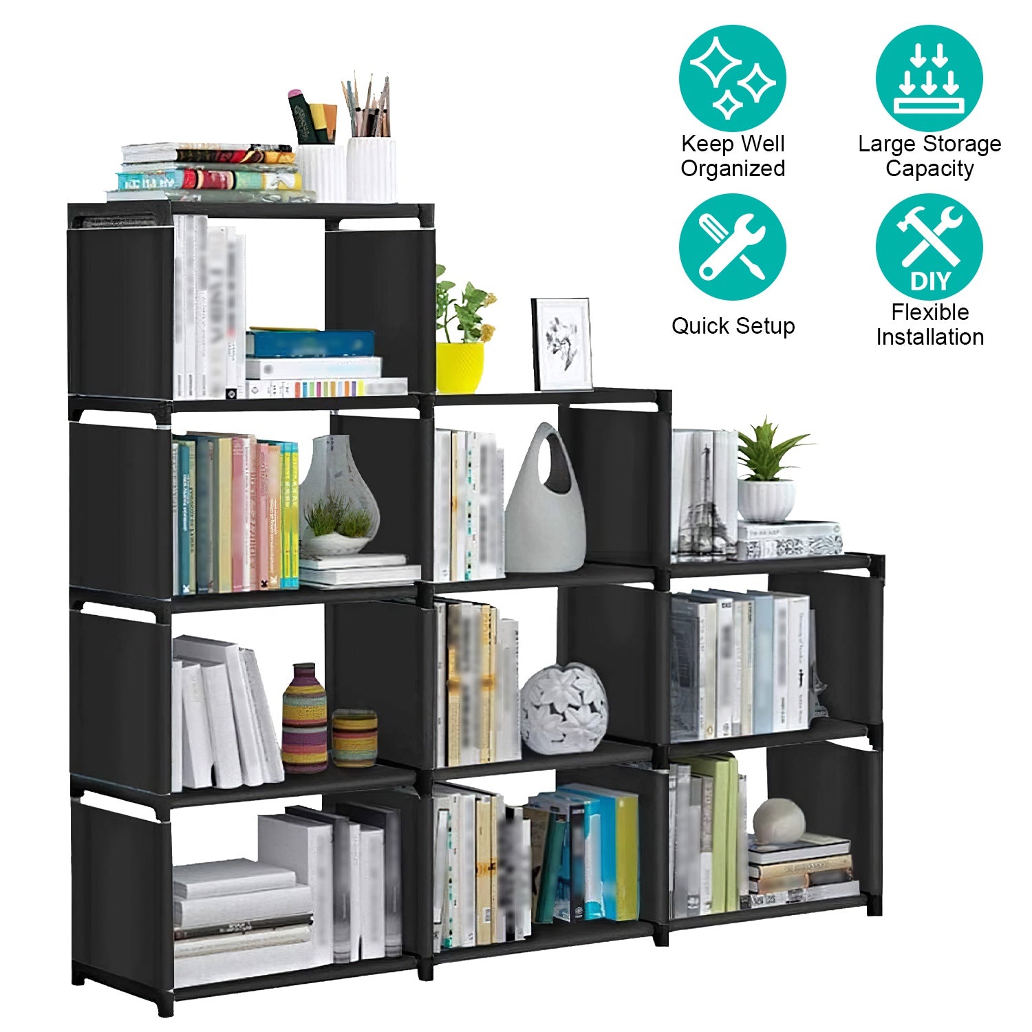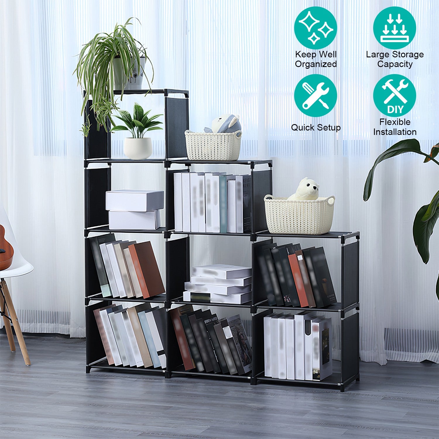 Are you tired of messy room which is full of objects? Our 9 cubes storage organizer is your perfect choice to help you keep room tidy and well organized. Each cube measuring 14.96x10.03x11.81in, 9 Cell in total has a large capacity to store various items. You can flexibly install these cubes according to you preference or to adapt the limited place. Made of thickened iron pipes and breathable non-woven fabric, our cube shelves are sturdy, durable, moisture-proof and have great loading capacity.