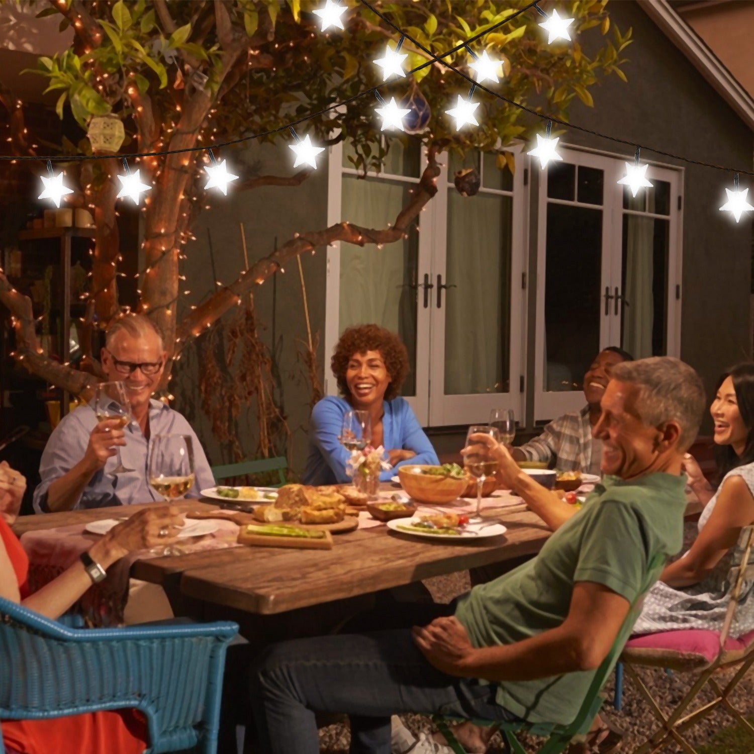Our star Solar Powered Lights, designed with 100Pcs cute and beautiful star beads dotted in a 39.3ft wire design, 8 Lighting modes meet different occasions. Designed with a light sensor, it AUTO ON at dark and AUTO OFF by day. 4Hrs fully charged the inbuilt 600mAh battery and light for 12Hrs. 39.3ft Wire can be mold into any shapes and decorate your yard, garden, fence, lawn and tree etc.. IP65 Waterproof performance and durable PC materials can resists high temperature or other harsh weather conditions.