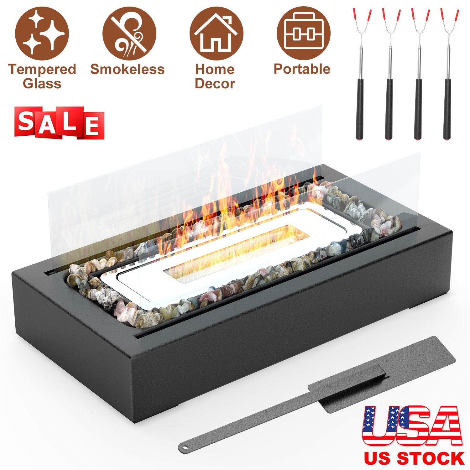 Our smokeless tabletop fireplace is the perfect addition to your indoor or outdoor space for a warm and cozy ambiance without the harmful smoke, soot, and ash of traditional fire pits. Including roasting sticks can be used to roasting marshmallows. Portable and lightweight design makes it portable for living rooms, patios, balconies, and gardens. Enjoy the flickering flames with peace of mind knowing it is fueled by clean-burning alcohol. Perfect choice for occasions like wedding anniversaries, Christmas, ValentineÕs Day, MotherÕs Day, or housewarming events.