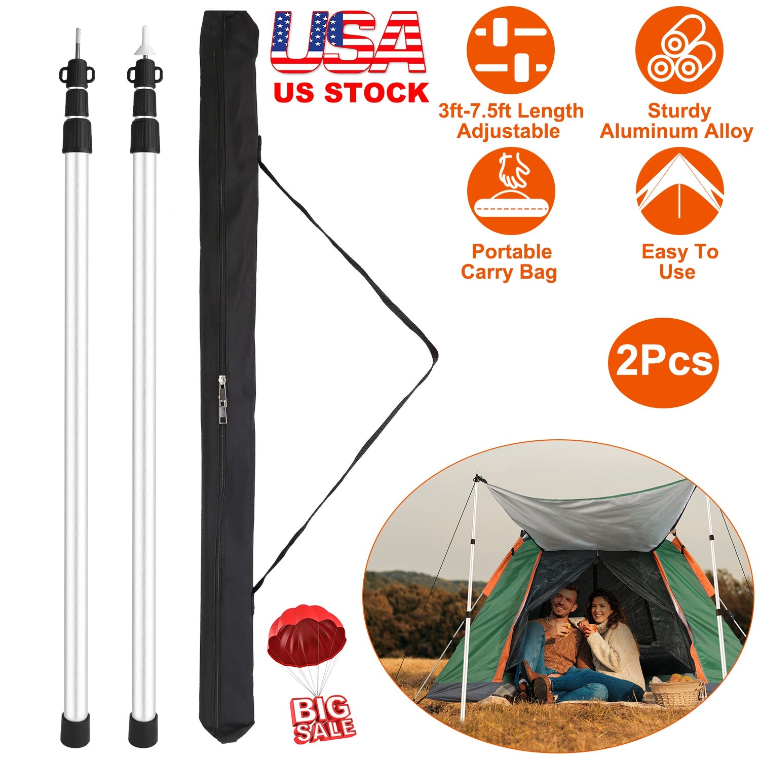 2Pcs Telescoping Tarp Poles Portable Aluminum Awning Poles 3-7.5ft Adjustable Telescopic Tarp Tent Rods