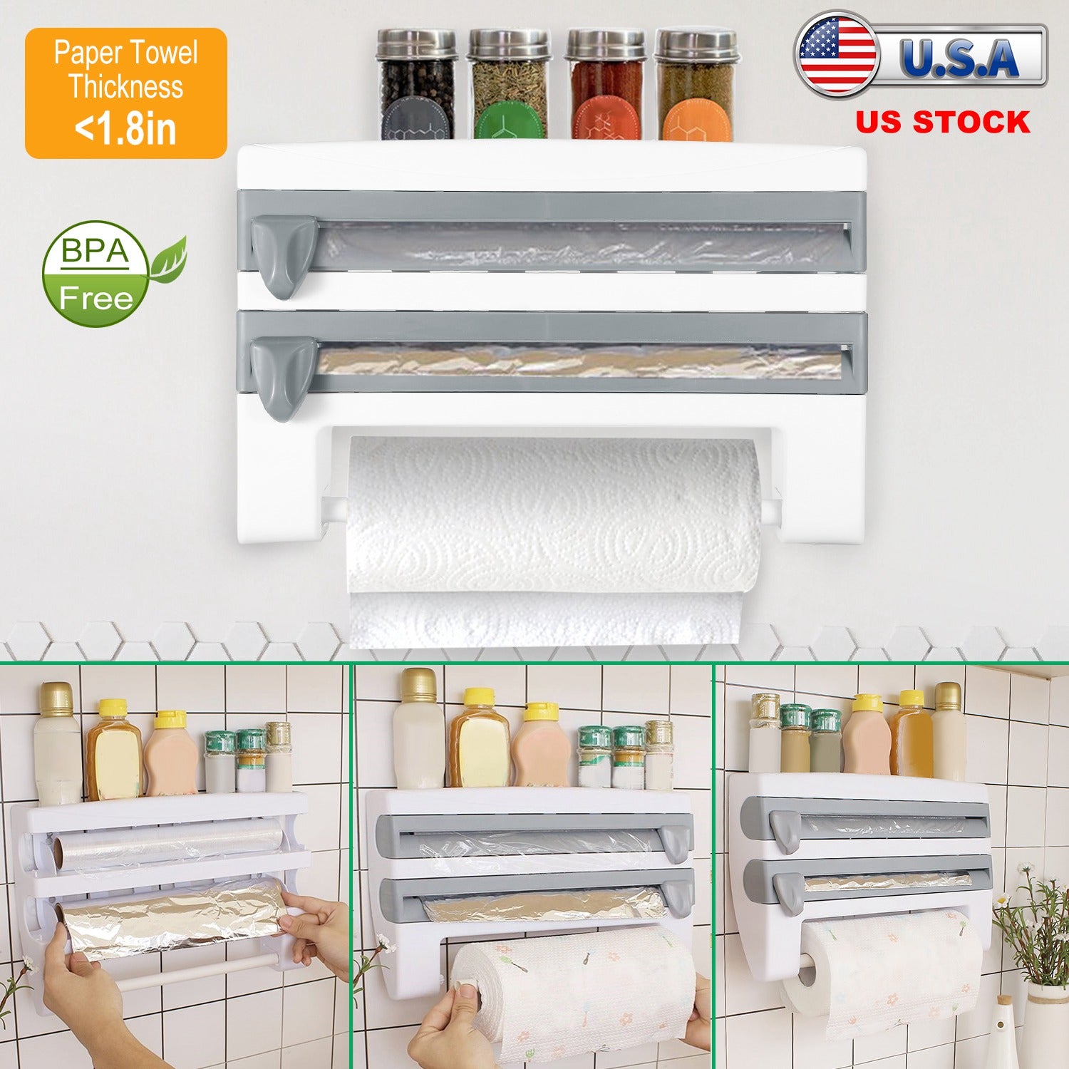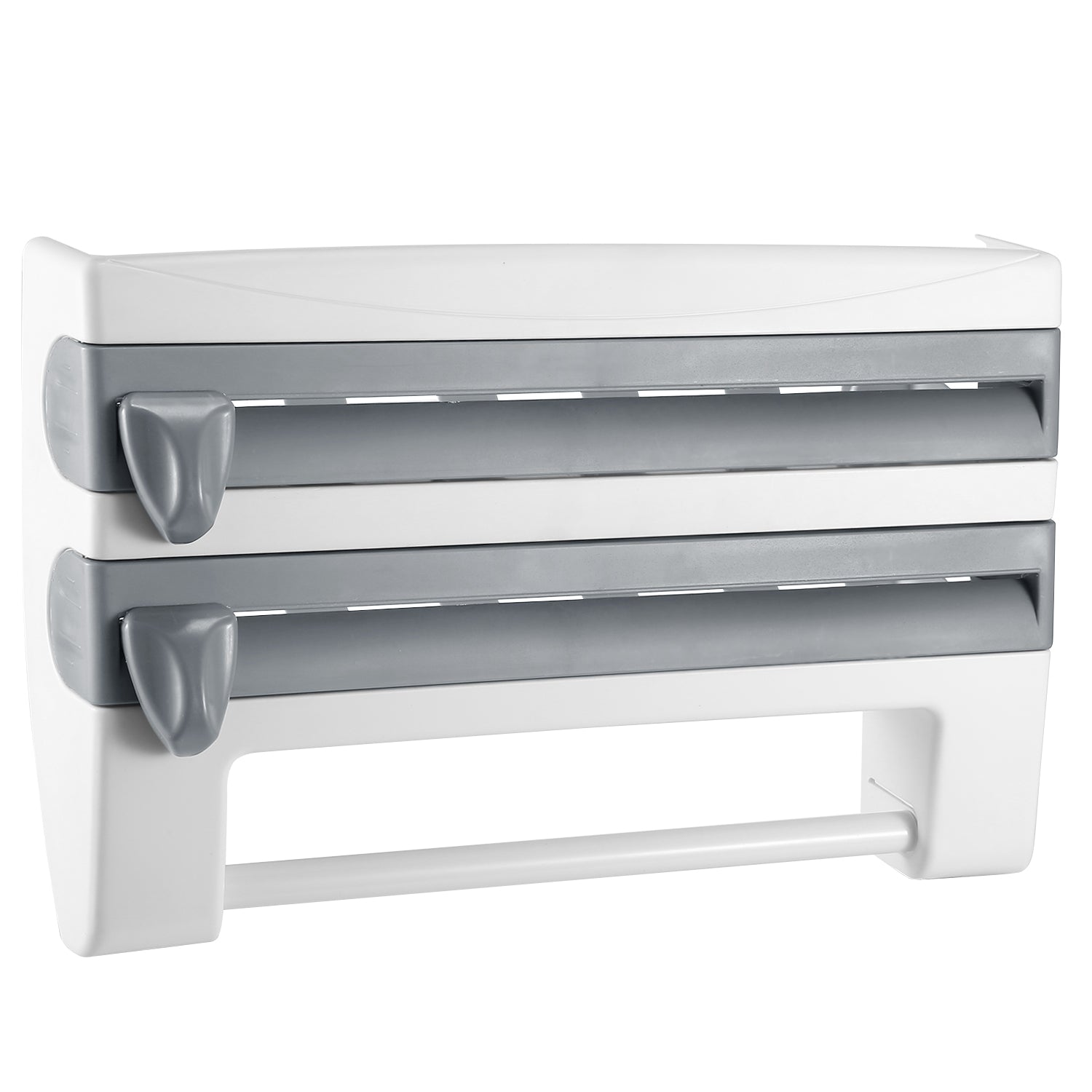 Kitchen Roll Dispenser Paper Roll Holder Plastic Wrap Film Foil Paper Organizer w/ Cutter Wall Mounted for Kitchen Bathroom