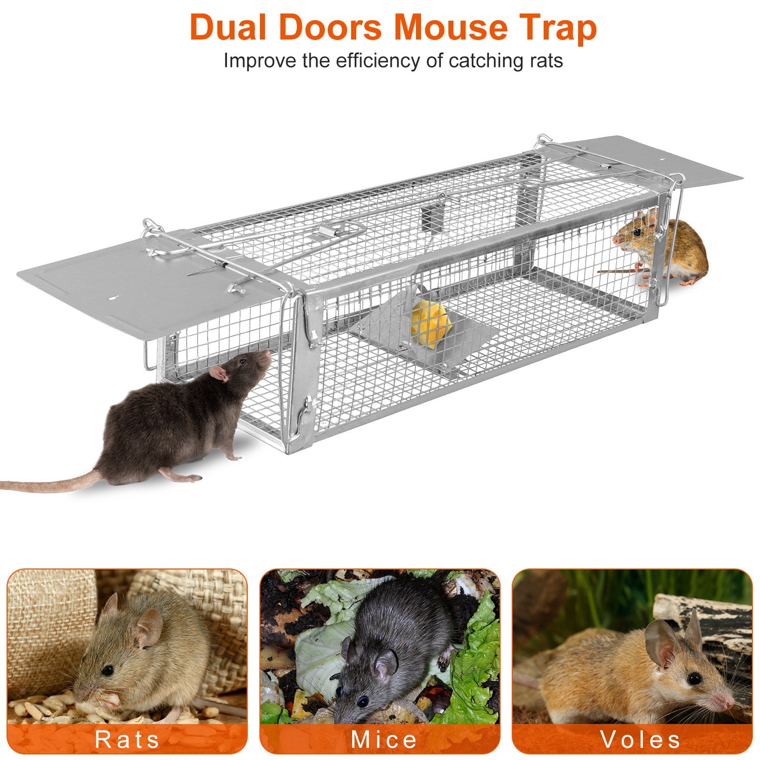 This is a sturdy and fantastic humane mouse or critter trap. You set the trap from the outside of the cage. Then drop some sunflower seeds through the top of the cage without having to put your hands inside no matter when used indoor or outdoor, or bait it with snacks attractant to trap voles, squirrels, chipmunks, mice, rats, weasels and other similar size animals. Additional latch followed by gravity once triggering completely prevents captive animals from escaping from the door. It is also easy to set the target caught animal free just by re-setting the trap. All sets in seconds. Dual door trap can catch dual mice simultaneously.