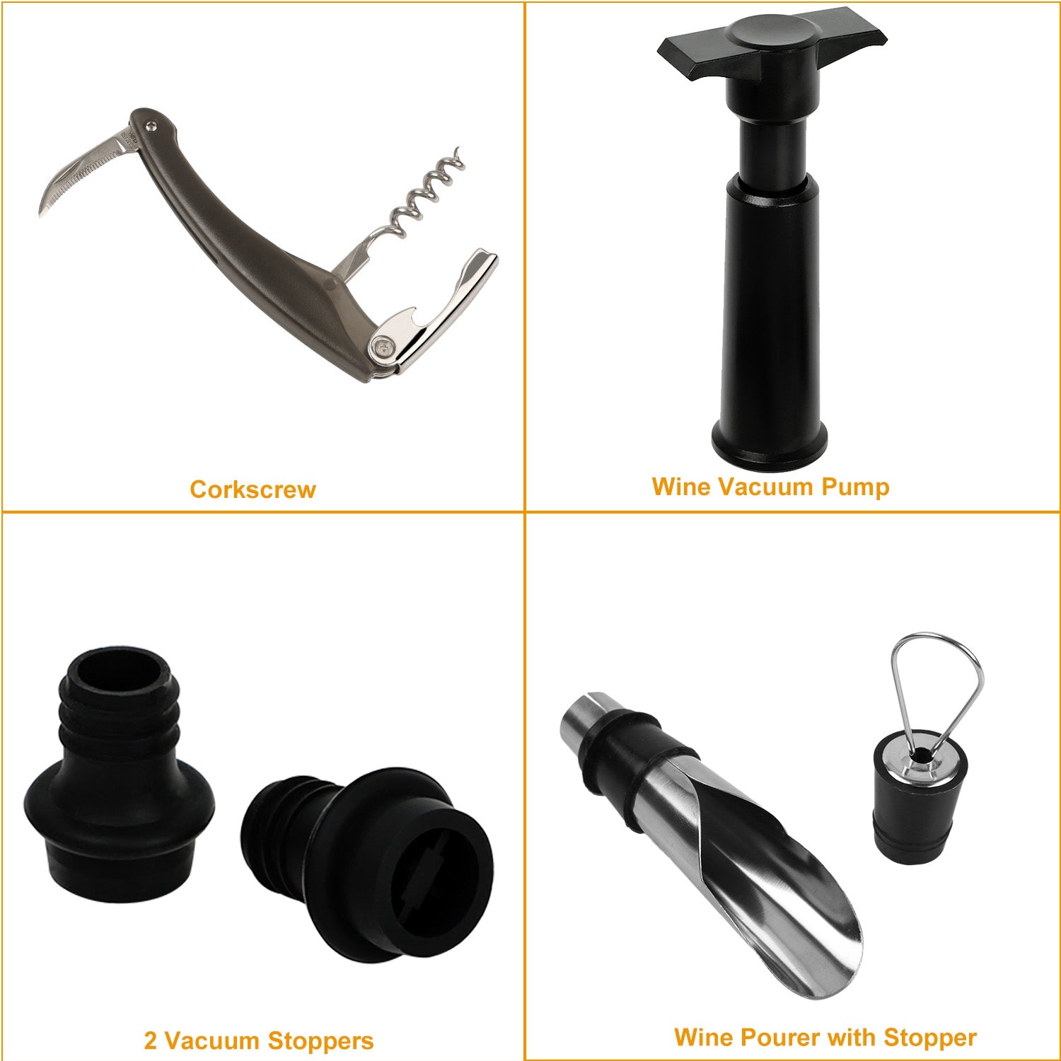 Our 5 pieces wine bottle set is a basic opener set including all things you may need during wine drinking such as corkscrew, vacuum pump, stoppers and wine pourer. Our products are made of high-quality stainless steel and aluminum alloy, which are abrasion-resistant and rust-proof. You can use the corkscrew to remove natural and synthetic cork easily, use the wine pourer to reduce spilling. And the vacuum pump and stoppers slow down the oxidation process. The opener set is light enough for you to carry it with you, saving the trouble of looking for openers everywhere when you want to open a wine. ItÕs a perfect gift for your friends and family as a Christmas, Thanksgiving, housewarming, birthday, wedding and anniversary gift.