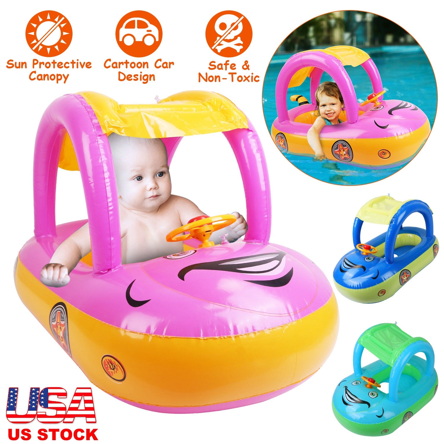 Baby Inflatable Pool Float Car Shaped Toddler Swimming Float Boat Pool Toy Infant Swim Ring Pool with Sun Protection Canopy for 1-3 Year-Old Kids Infa