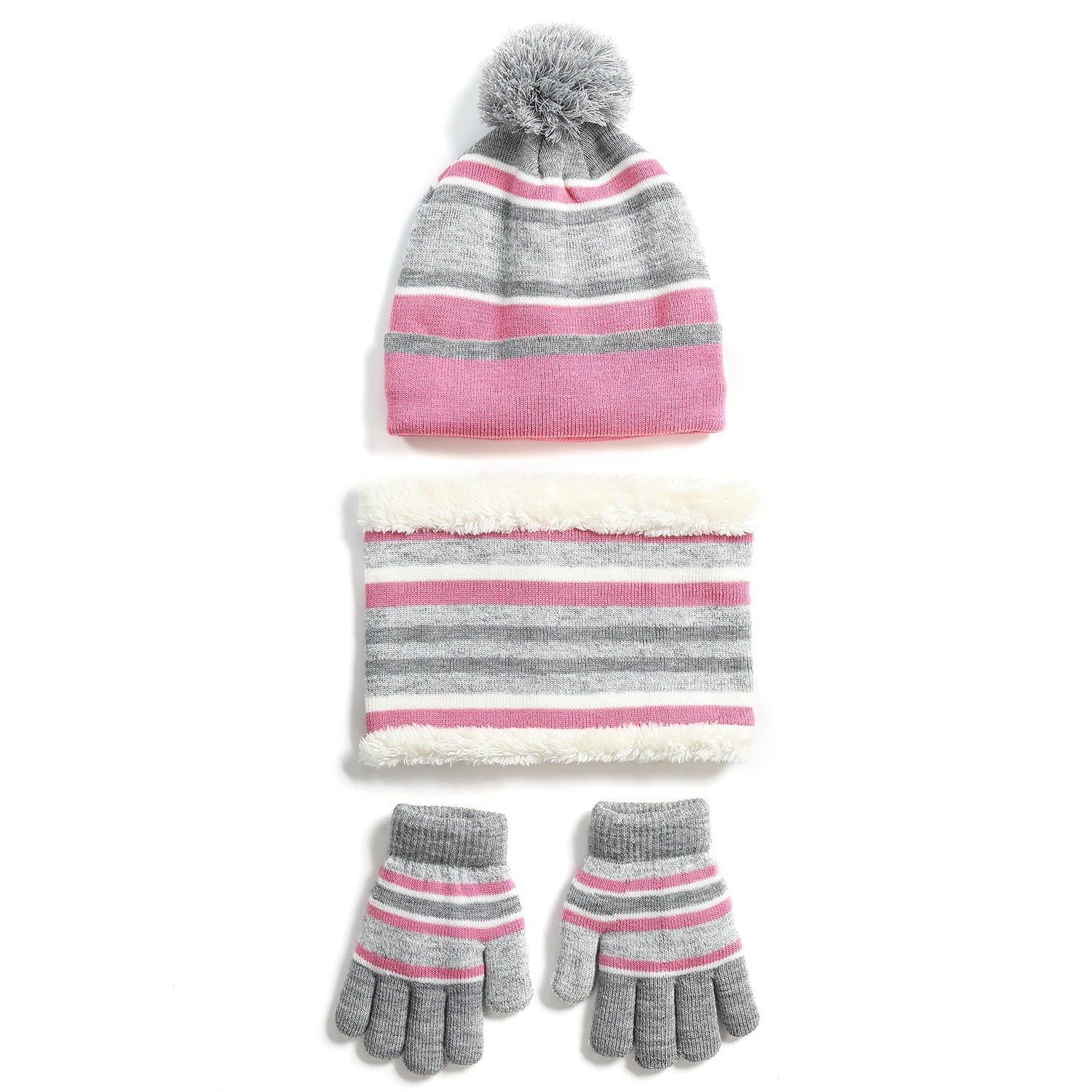 Winter is coming. It\'s time to take this winter warm gear home and take care of your kids! This 3Pcs knitted set includes a kids beanie hat, a neck scarf and a pair of gloves, which is able to fully keep your child warm and comfortable when the temperatures drop, allowing them to have fun outside freely even in chill winter. Soft acrylic knitted fiber with thick polyester fleece lining material make the set soft and skin-friendly to wear. Suitable for 4-7-year-old boys and girls in both daily life and outdoor activities in chill winter. Perfect gift for your kids in their birthdays, Christmas and special holidays.