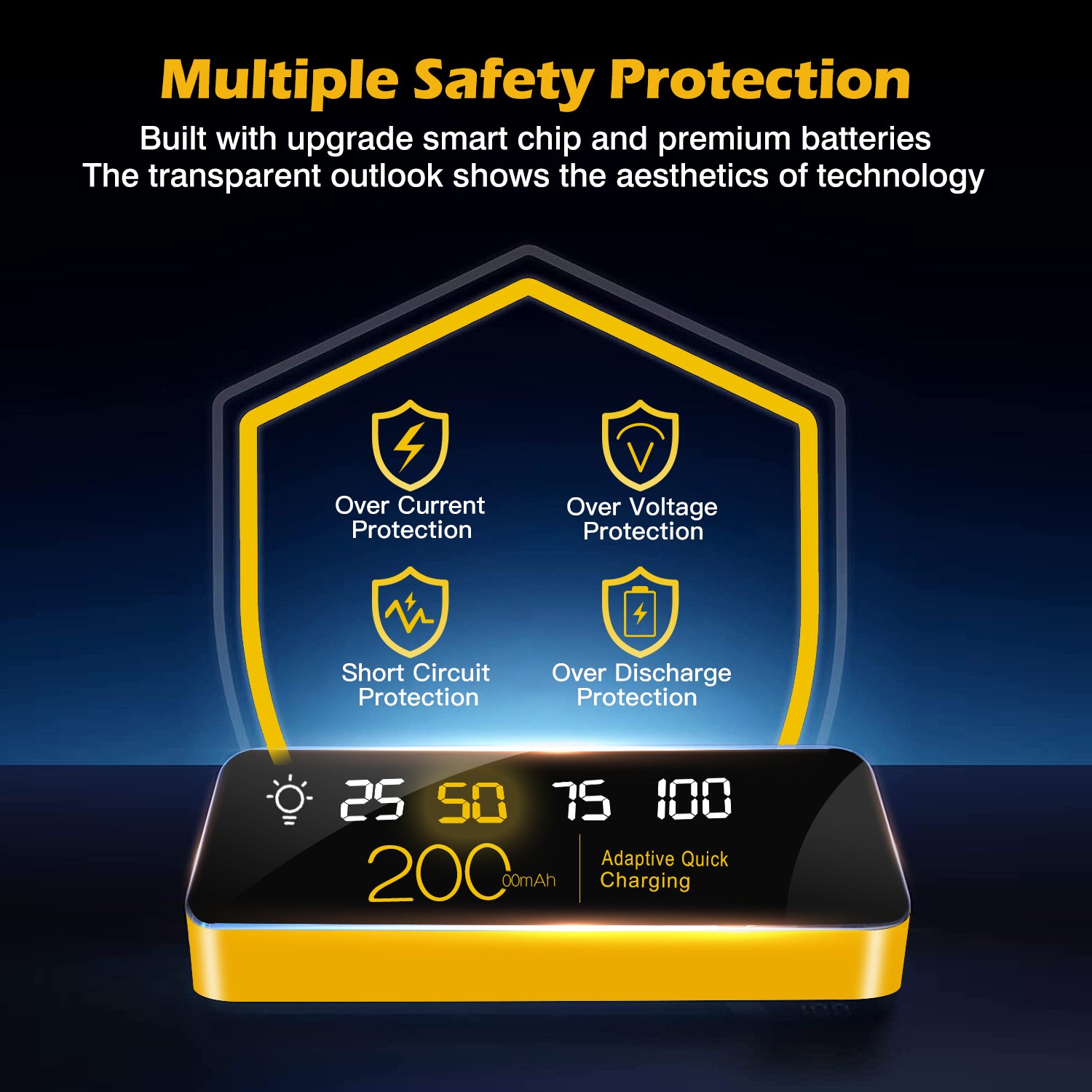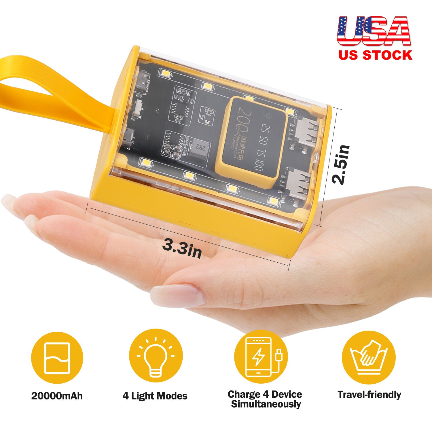 20000mAh Transparent Power Bank Portable Mini Phone Charger External Battery Pack with 3 Inbuilt Cables 4 Light Modes Digital Display Handle