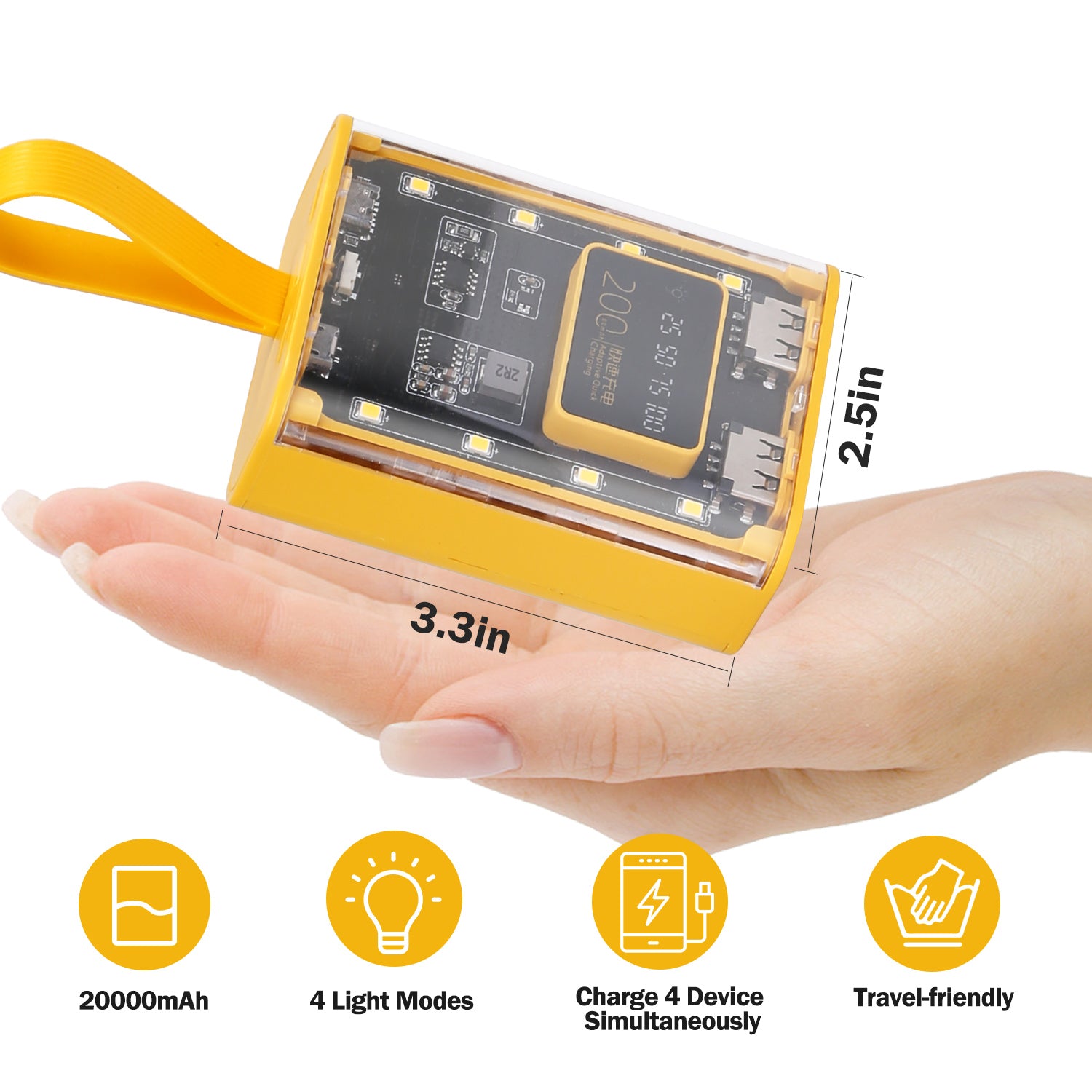Our mobile power bank provides a total power up to 20000mAh, 3 different types of built-in cables to ensure the charging of all models of mobile phones , and an accurate power status display for you in real time. Advanced circuit and high efficiency power management can protect your electronic devices from over-current and short-circuit. The transparent outlook fully demonstrates the aesthetics of science and technology. Comes with 4 light modes, the built-in LED provides a quick solution to illumination in darkness. Palm size and the included handle make it an optimal choice for travelling and working.