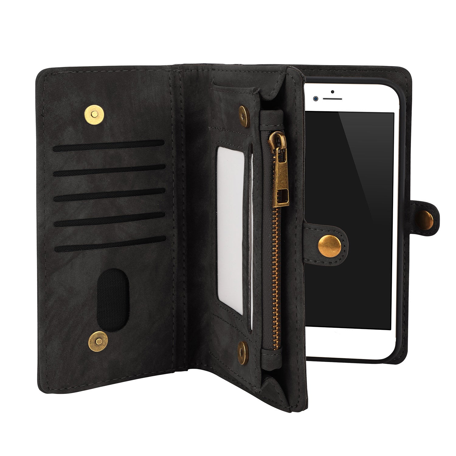 This dual-folio wallet not only holds your credit cards/debit cards, license, bills and other small items with 13 cards slots and 1 zippered changing pocket but also provides a slim phone case for your iPhone 6s Plus. There is snap closure for 2 folio wallet to better separate it with the phone case section. The phone case can be detached from this wallet and you can stick your phone with it to any metal at ease. The button clasps are magnetic and clip into place well. It is precisely stitching- very stylish.