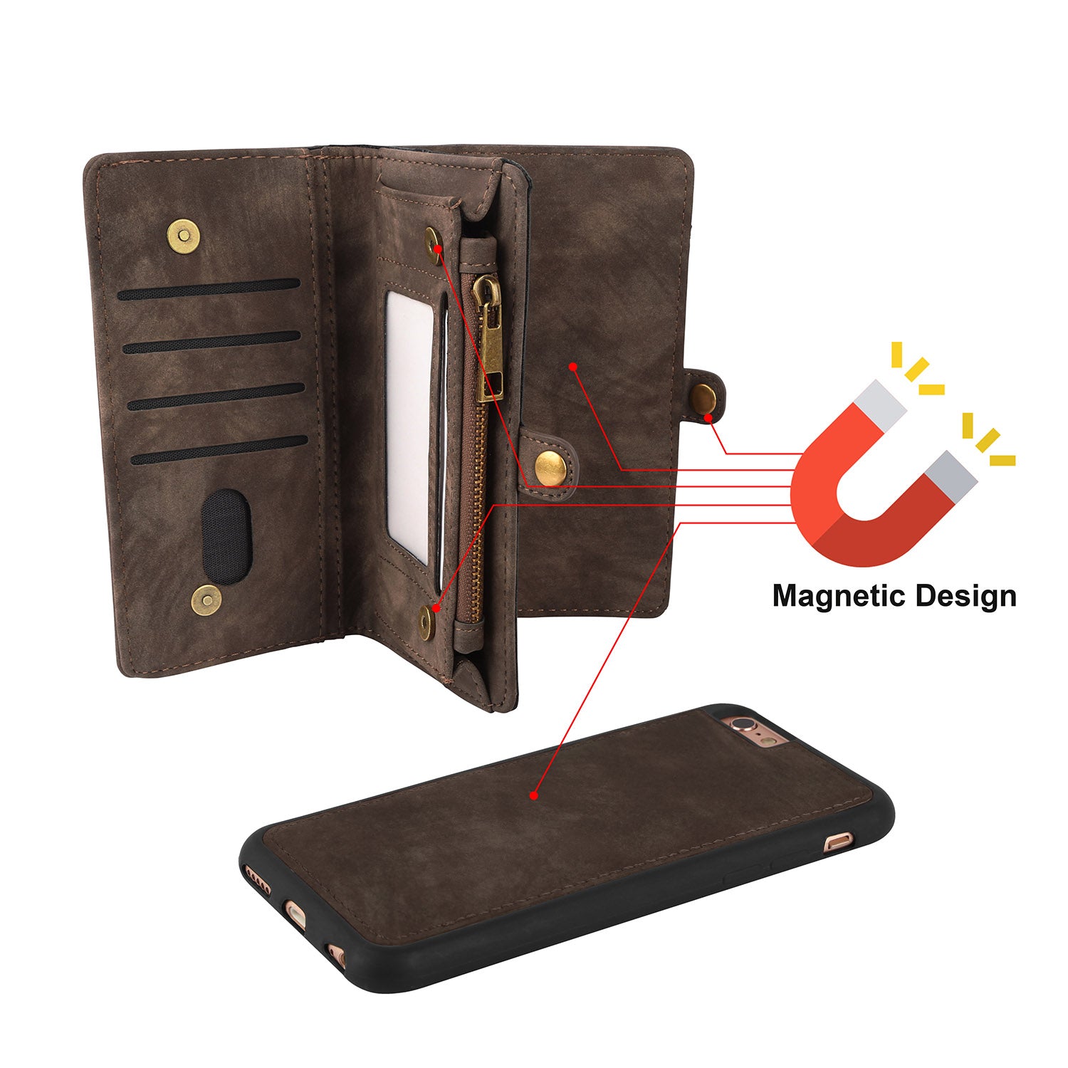 This dual-folio wallet not only holds your credit cards/debit cards, license, bills and other small items with 13 cards slots and 1 zippered changing pocket but also provides a slim phone case for your iPhone 6s. There is snap closure for 2 folio wallet to better separate it with the phone case section. The phone case can be detached from this wallet and you can stick your phone with it to any metal at ease. The button clasps are magnetic and clip into place well. It is precisely stitching- very stylish.