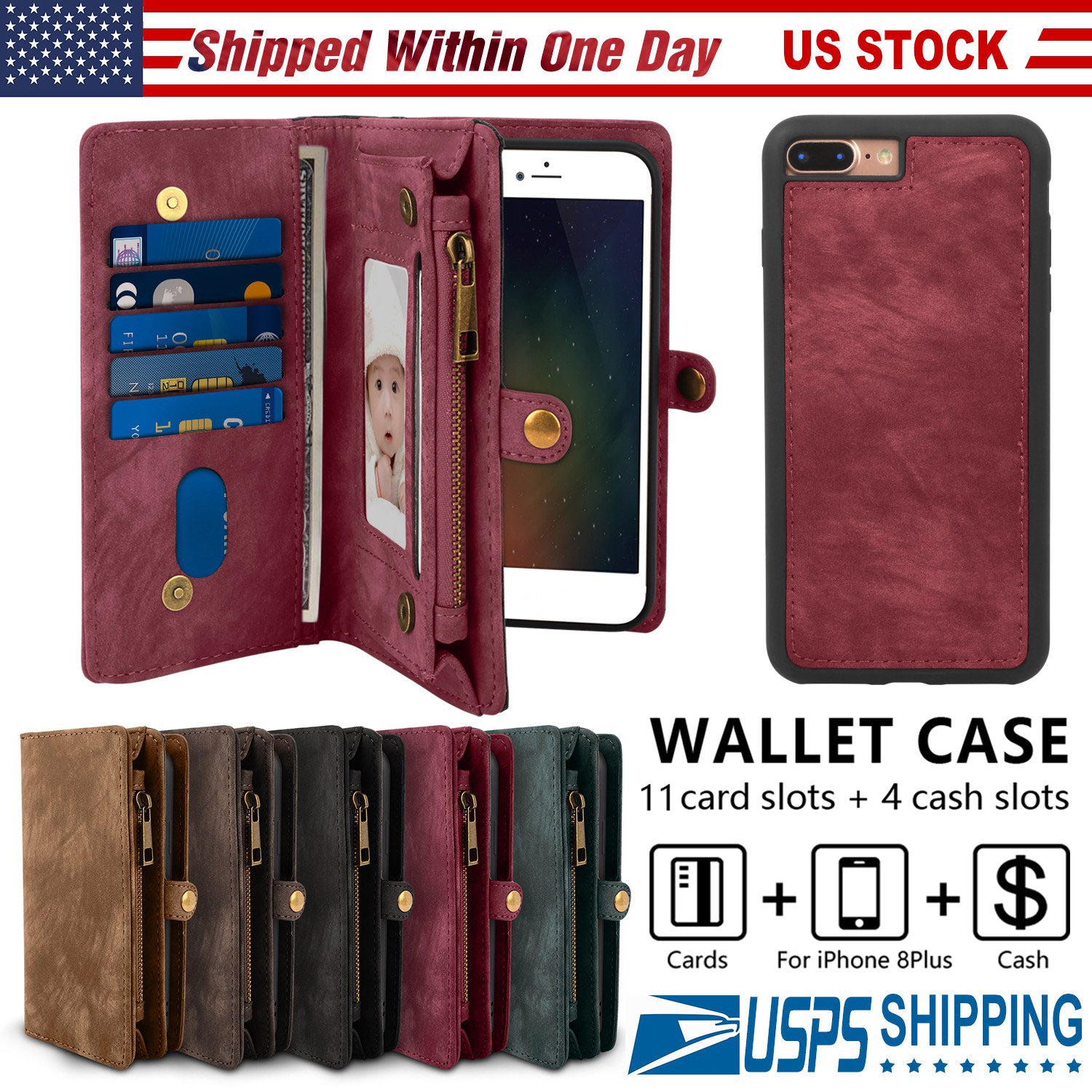 Phone Wallet Case For iPhone 8 Plus Portable Wallet Case 2 in 1 Leather Zipper Magnetic Detachable 15 Card Slots Money Pocket Clutch Cover W/ID Widows
