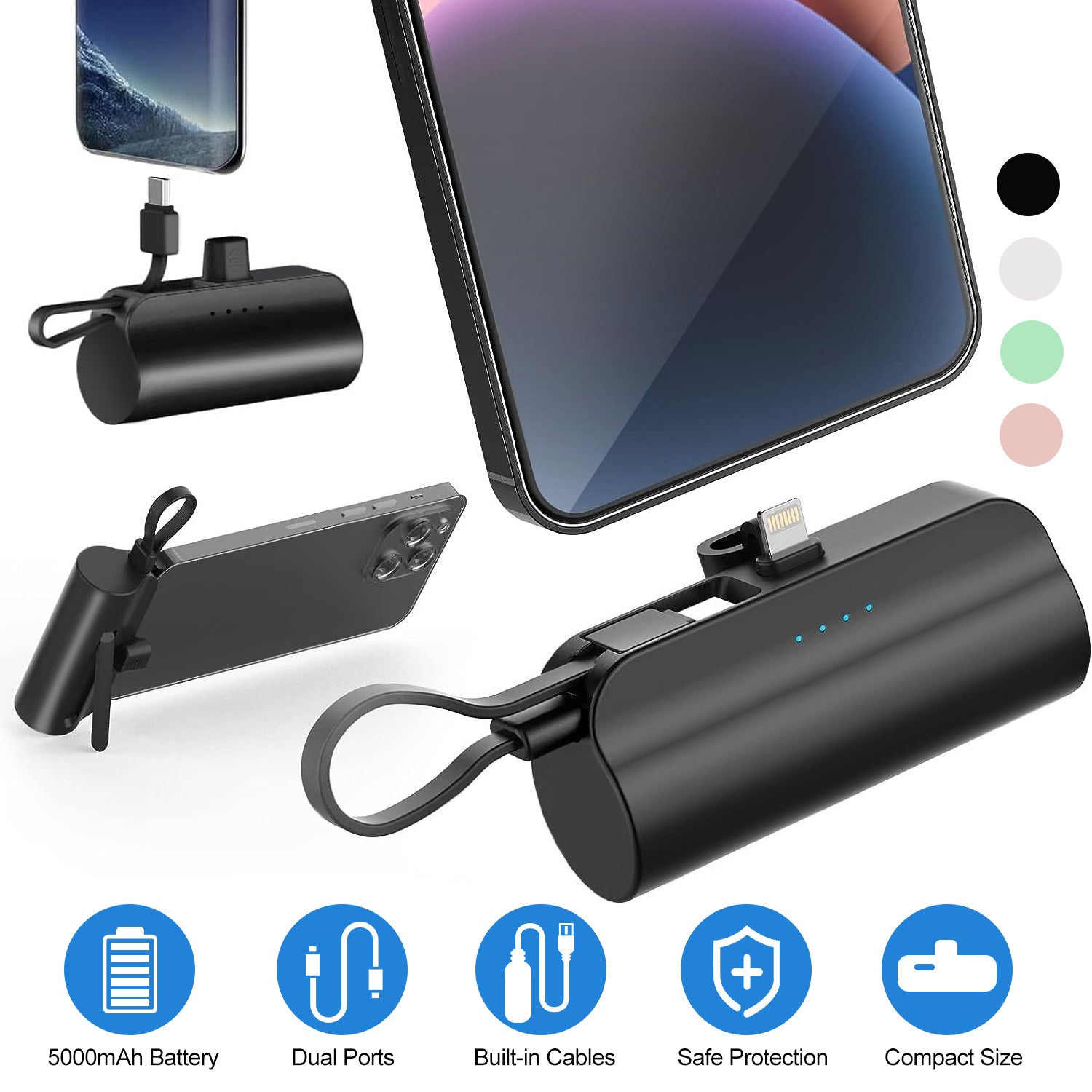 5000mAh Portable Phone Charger Built-in Type-C IOS Cable Dual Output Power Bank Compact Size Compatible with IOS Phone Samsung